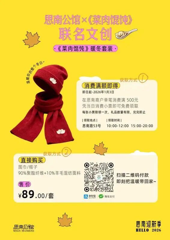 同时,即日起至2026年1月3日,在思南公馆指定商户当日消费满200元或500元,也可以免费领取相关文创产品一件。