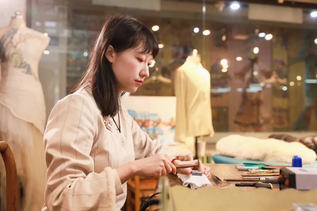 除了身为非遗传承人,张超也是上海工商职业技术学院珠宝与艺术设计学院教师。为了让非遗更年轻化,她和“Z世代”年轻人深入交流,了解他们的兴趣与审美。同时,她带领学生团队利用AI技术,打造萌态可掬的AI娃娃“小香”,人们只需开启蓝牙靠近,便能聆听到压金丝嵌宝的历史故事与制作流程,将传统技艺与现代科技完美结合。