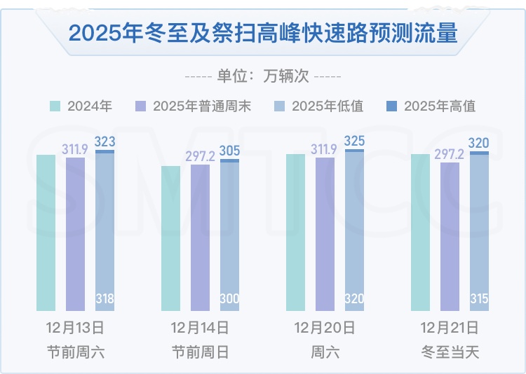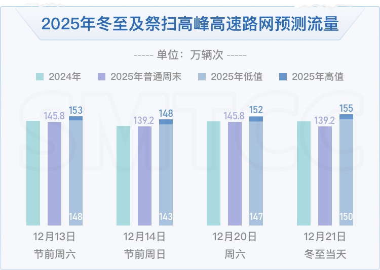 节前周末(12月13日、14日):预计祭扫车流规模上升,尤其是通往主要墓区道口流量不断攀升,扫墓出行特征明显。