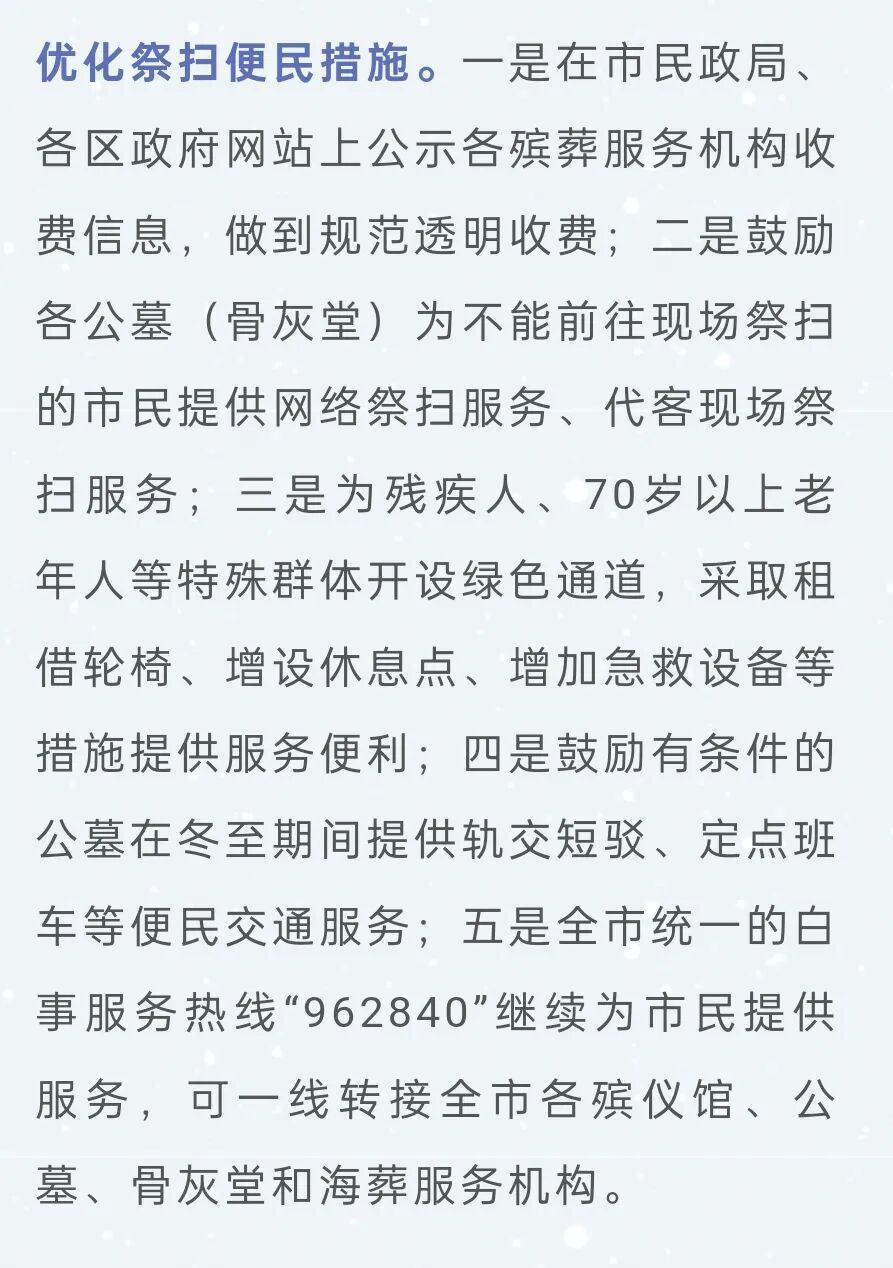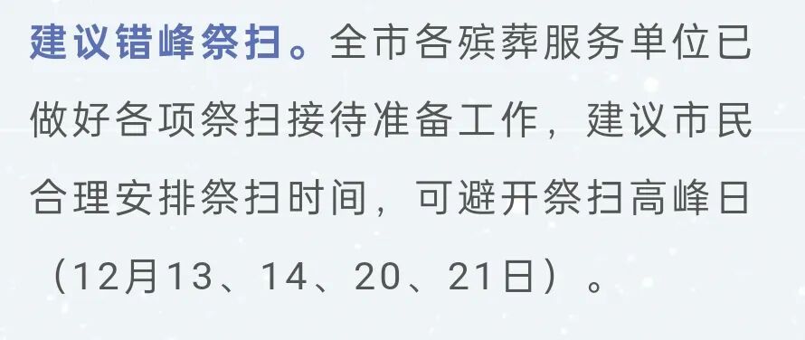 据市交通委指挥中心介绍,2025年冬至日为12月21日(星期日),本市将按照“错峰引导及规范服务”等要求,保障冬至祭扫安全有序。据专业部门预测,2025年冬至期间祭扫高峰将出现在12月13、14、20、21日(共4天),祭扫人、车流量达111.1万人、22万辆车,其中12月21日冬至当日人、车流量分别达59.8万人、11.9万辆车。详见↓