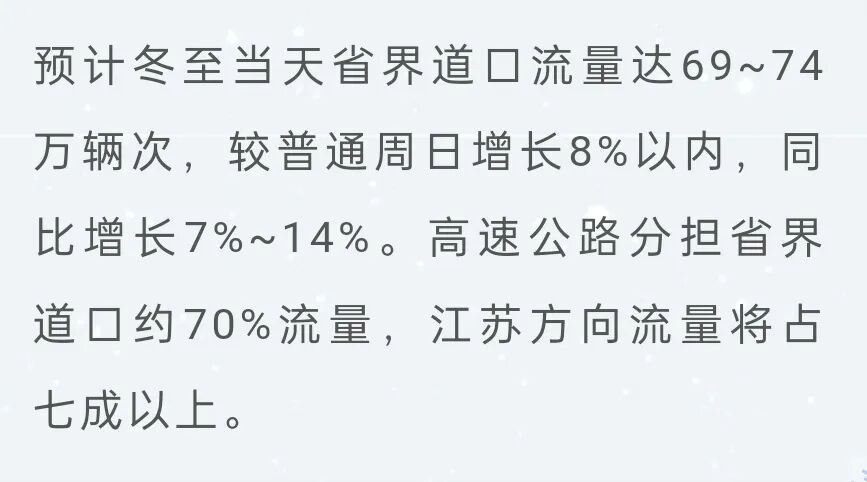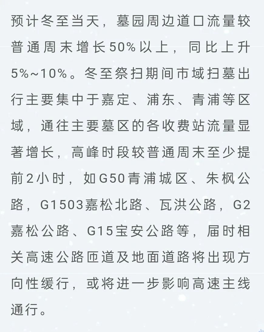 冬至当天(12月21日,周日):祭扫需求集中释放,祭扫去程高峰为6时—9时,祭扫返程高峰为10时—12时,祭扫车流的方向性特征将造成部分射线高速公路(如G2京沪、G40沪陕长江桥隧、G50沪渝、G60沪昆)及墓园周边匝道出现较大范围缓行甚至一定时间的拥堵。