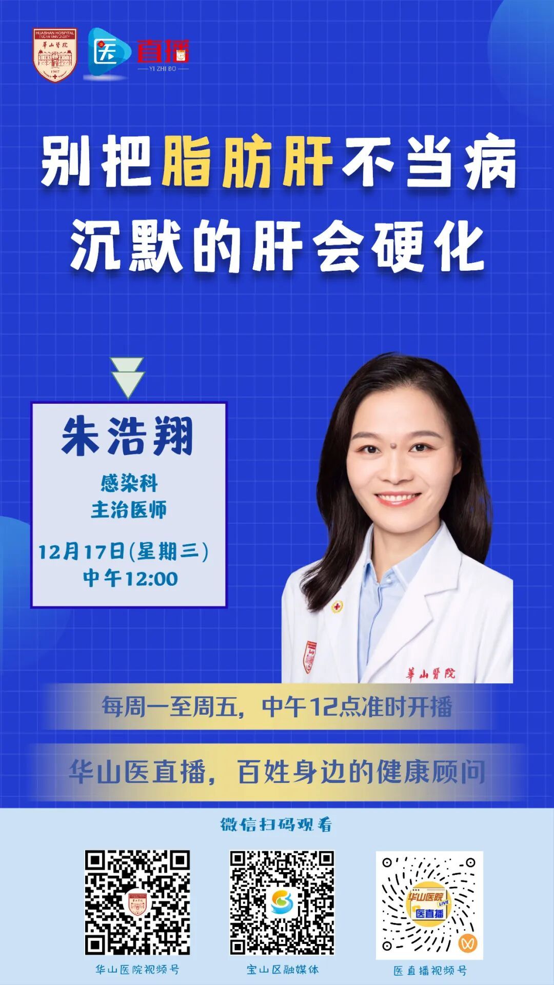 大家是不是总觉得得了脂肪肝没啥事情,少吃点多运动就没事了?结果照样该吃吃该喝喝,体重不减反增,转氨酶一直就没下来过,哪一天突然间怎么就发现自己肝硬化了,肝癌了,这不是乙肝病人才会得的么?由于肝脏的沉默,很多人即使到了肝硬化和肝癌阶段都没有症状。本期医直播,复旦大学附属华山医院感染科主治医师朱浩翔,带大家了解早期监测,早期预防和治疗脂肪肝,避免进展到肝硬化或者肝癌阶段。