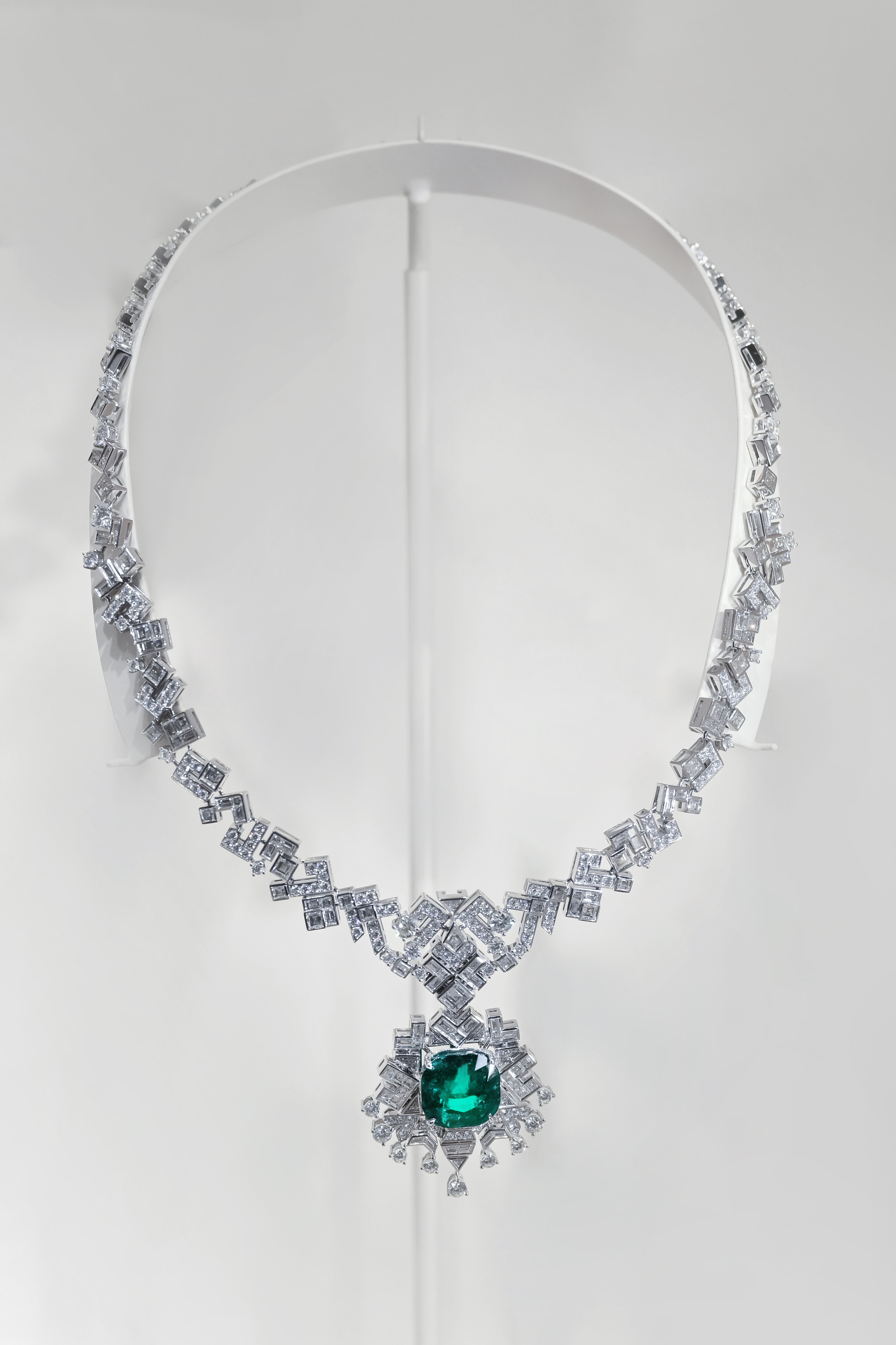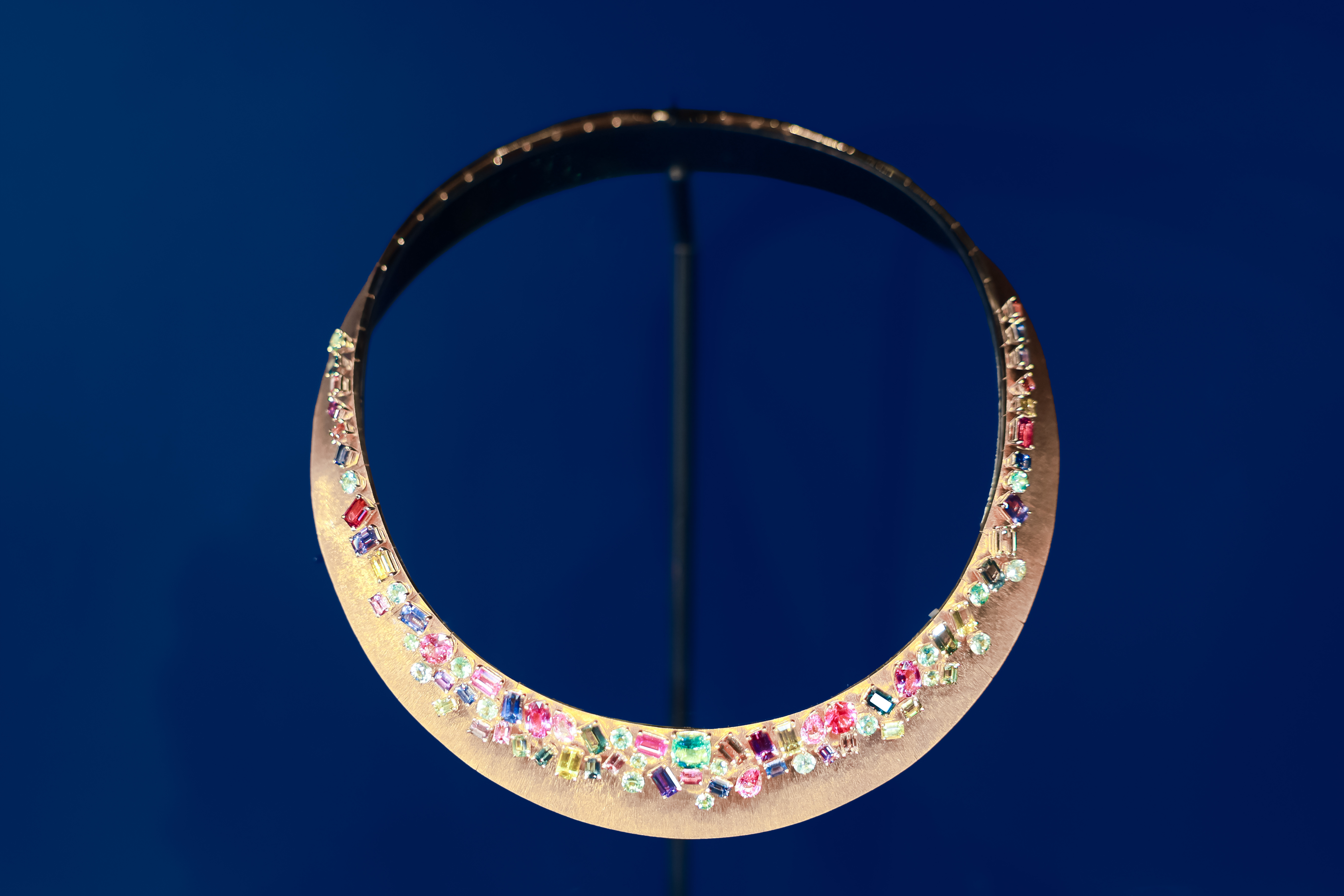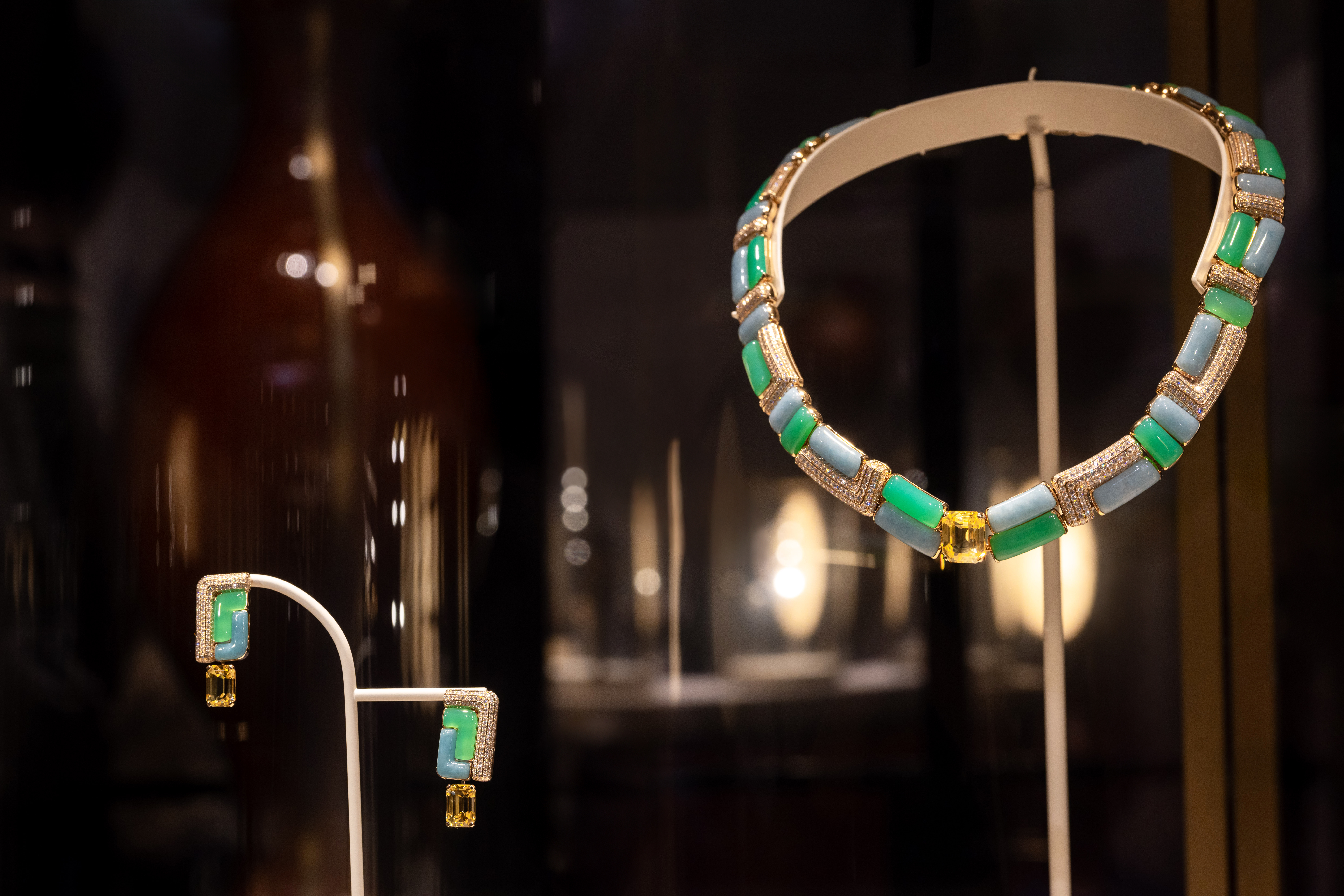 特别呈现的 Curved Artistry 弧光艺境主题项链以八角形切割黄色蓝宝石为主石,搭配陨硫铁与绿玉髓等非凡材质,在圆弧造型与多元材质的交相辉映中,演绎品牌对色彩与形态的大胆探索。