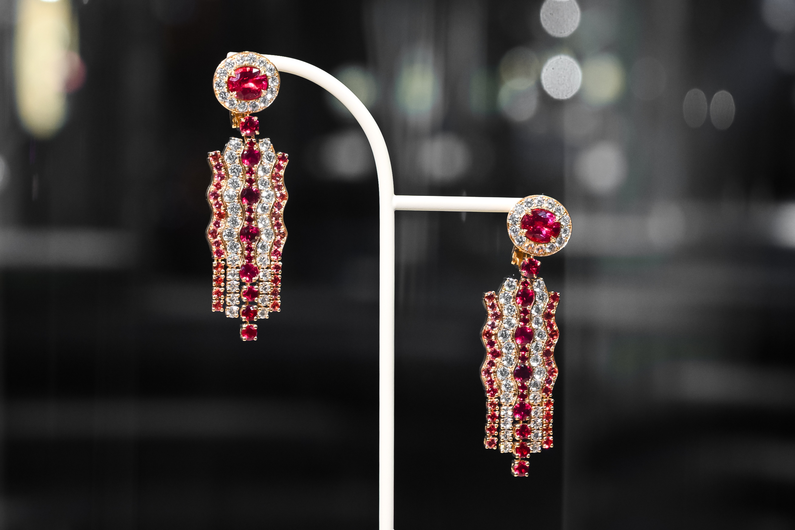 其中,两件高级珠宝主题作品尤其耀眼:Wave Illusion 光影幻彩主题作品以珍稀迷人的红色和橙粉色尖晶石与钻石之间的层叠镶嵌, 打造出如波浪般起伏的视觉幻象,流转出动态的光影韵律;Gleaming Shapes 溢彩之形主题作品以三角与方形交错组合的震撼构图致敬索特萨斯对多元形态的精湛驾驭,将基础几何元素转化为蕴含动态张力与表现力的艺术载体。
