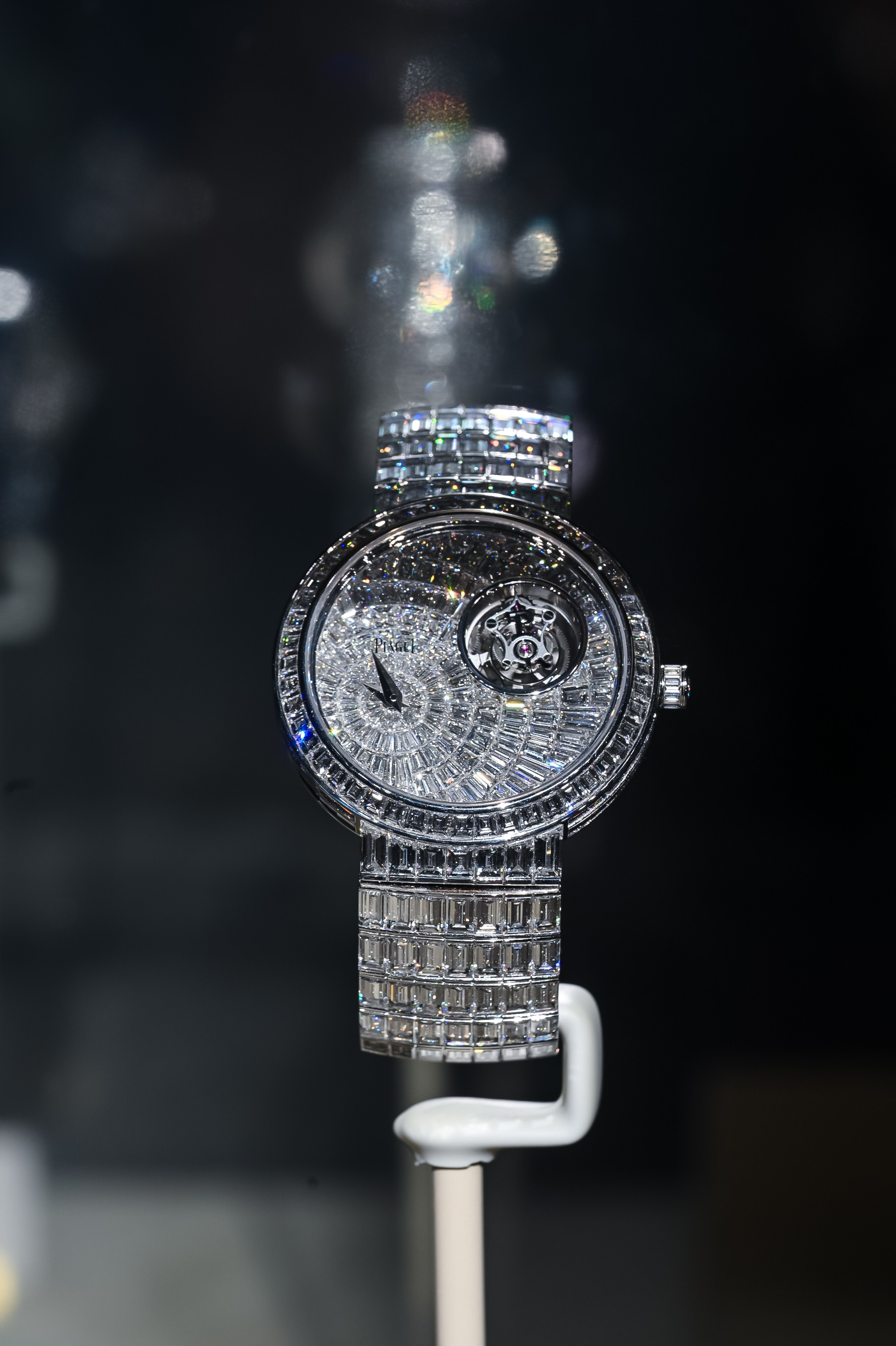 Altiplano 至臻超薄系列陀飞轮高级珠宝腕表在直径42 毫米的18K白金表壳上密镶逾70克拉的长阶梯形切割钻石,搭载670P超薄手动上链陀飞轮机芯,展现出超薄制表工艺与高级珠宝艺术的极致对话。PIAGET伯爵Polo 79腕表系列经典黄金款式与珍稀白金款式也同时亮相展区,以现代视角续写其优雅亦不羁的风格传奇。