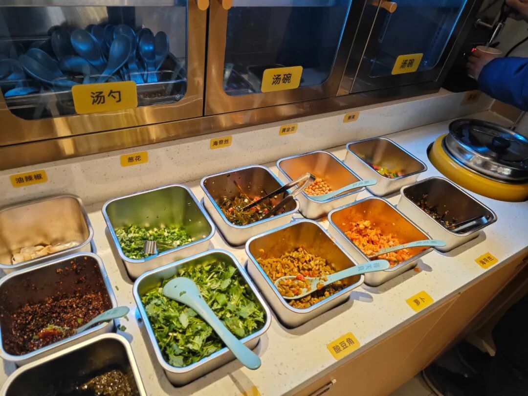 当天店内客人不少,但秩序井然。这不仅得益于流畅的取餐动线,也与店里免费提供的小菜密不可分。在取餐窗口旁的内嵌食盒里,除了辣椒、酸菜等调味品,还摆放着酸豆角、腌萝卜、海带丝等小菜,供顾客自行取用。