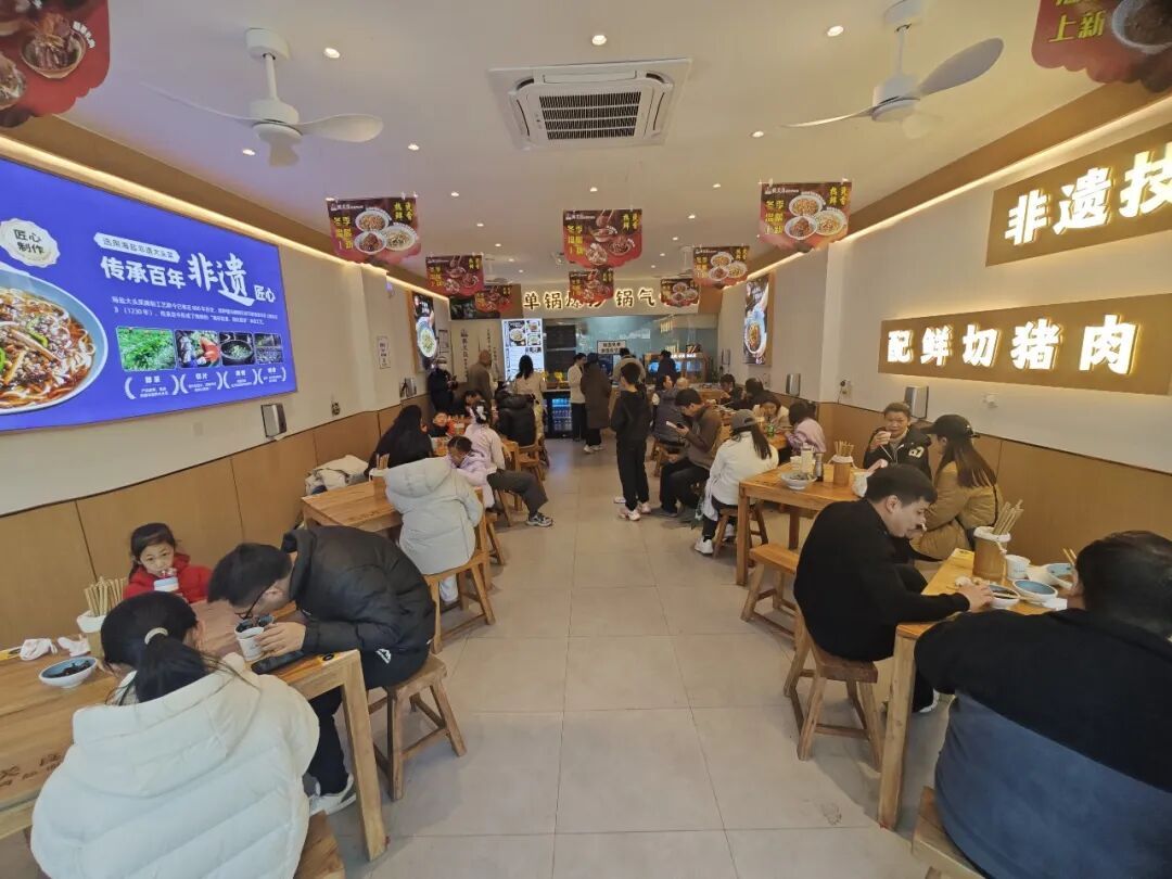 值得一提的是,透过玻璃窗可以清楚地看到后厨炒锅在自动颠勺。原来,这是面馆刚刚引进的机器人翻炒设备。“用机器人炒面又快又匀,不仅保证了每一碗面的标准统一,也极大地节省了人力和用工成本。”易娟介绍,“以前必须雇佣厨师学校毕业的专业大厨来掌勺,现在有了‘机器人’,普通员工也能轻松做出一碗地道的面。”