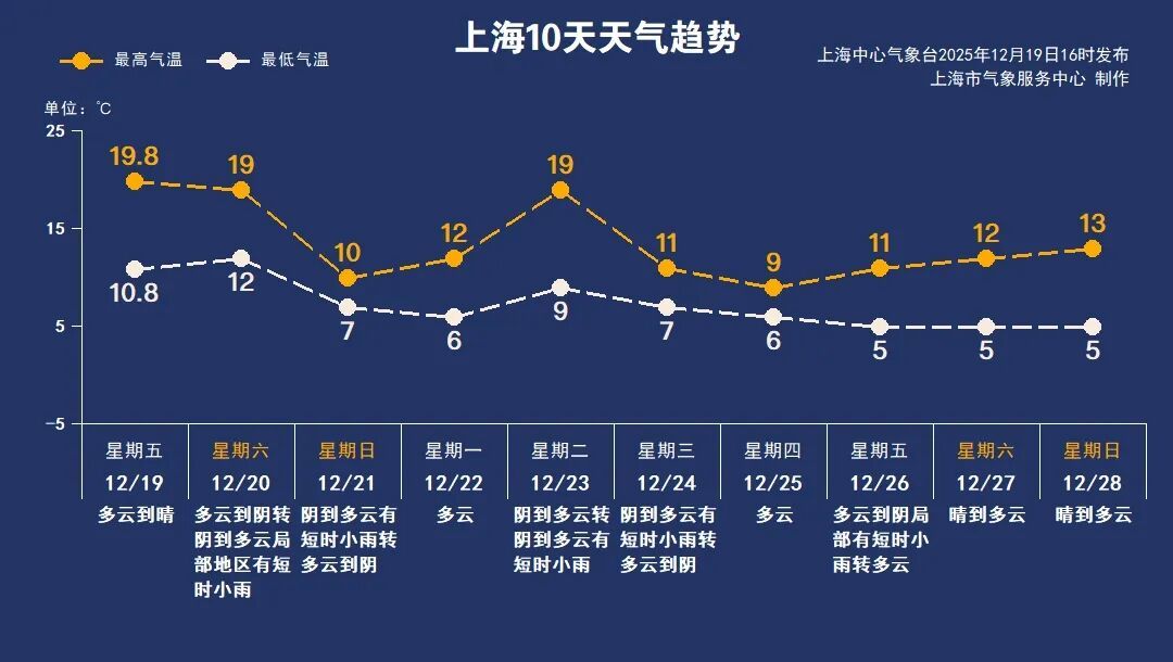 周日天气迅速大变脸 白天风力进一步增大至5级阵风6—7级 全天气温跌至7—10℃ 没有阳光加上呼呼北风 一下跌入冬日体感 下周一体感仍较冷 早间中心城区最低气温在6℃左右 郊区在2~5℃之间 冷暖空气轮番控场 下周二又将出现一个气温高点 最高可达19℃ 伴随着阴天小雨 体感变得暖湿起来 下周三起 受新一股冷空气影响 申城将开启新一轮入冬冲刺 未来十天 本市气温“大起大落” 冷暖转换迅速 请大家关注最新预报信息 及时增减衣物 谨防感冒