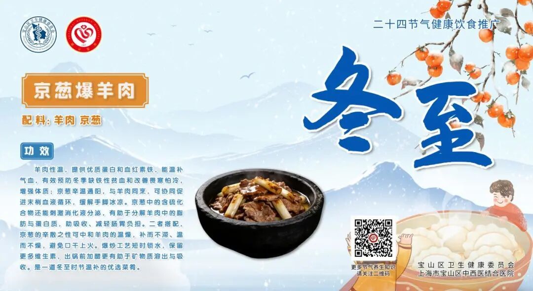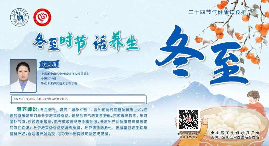为积极践行国家卫健委“二十四节气养生与健康”理念,深度响应宝山区卫健委“健康四季——二十四节气话健康”特色科普品牌,宝山医院依托中西医结合专业优势,组织资深医师与营养师团队,将节气养生智慧与现代营养学深度融合,重磅推出二十四节气系列健康养生膳食。 本次聚焦冬至时节,特别推出“冬藏补阳·固本养元”系列,精选时令食材打造菜肴、汤羹、粥品、点心等养生组合,助您以食为养、以养代疗,顺应阳气内敛、肾气当令的气候特点,在阴气最盛、一阳初生之时开启冬季科学养生之旅。 冬至 冬笋塔菜炒香菇 冬至 京葱爆羊肉 冬至 杜仲枸杞炖乌鸡 冬至 茯苓山药粥 冬至 红枣马蹄糕