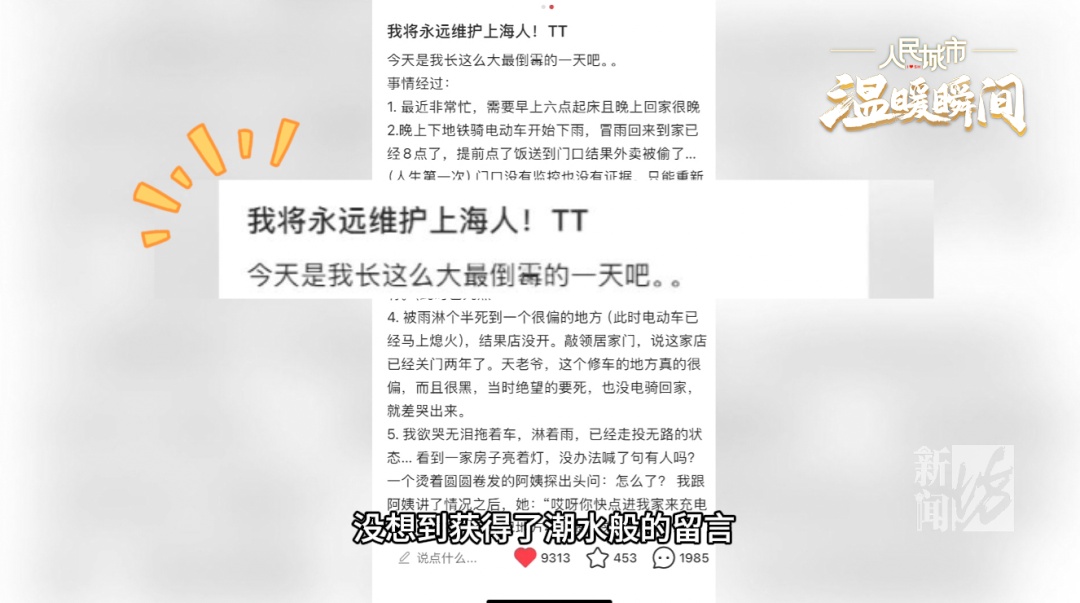 11月7日雨夜,女孩小波经历了很不顺利的一整天后,推着没电的电瓶车、淋着雨,绝望无助地走在浦东高新河路上。没想到她轻声的求助,被路边一户民居中的阿姨听到,这位烫着“卷卷头”的上海阿姨毫无保留地热情帮助了她,也治愈了女孩濒临崩溃的心。