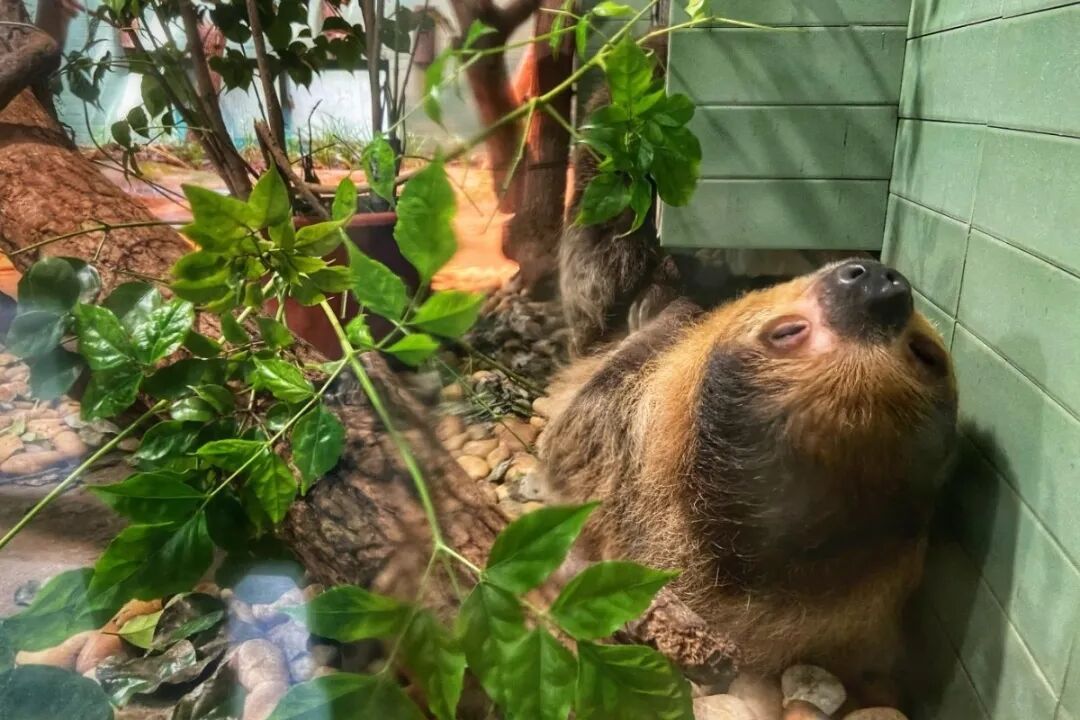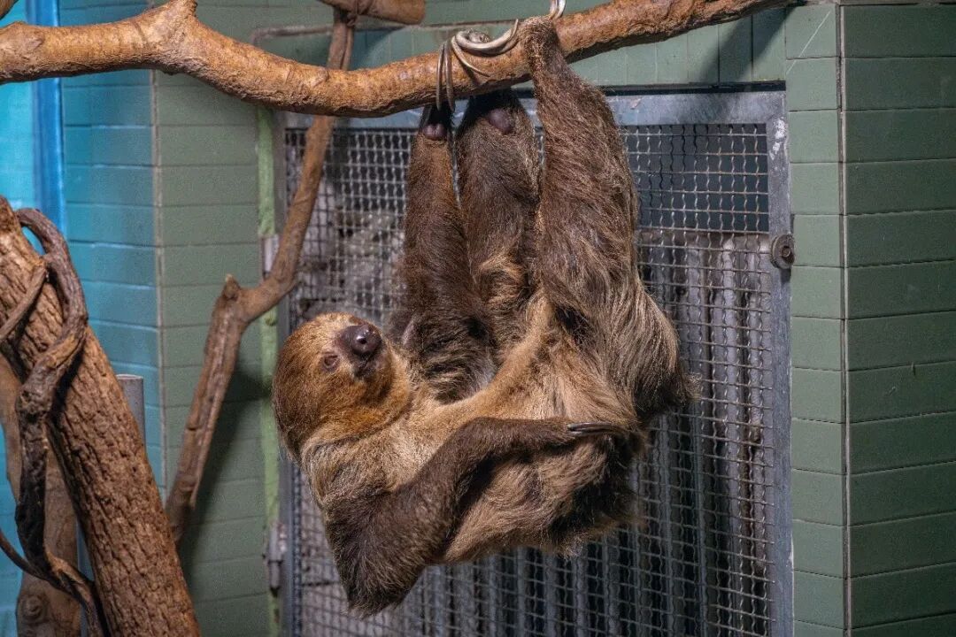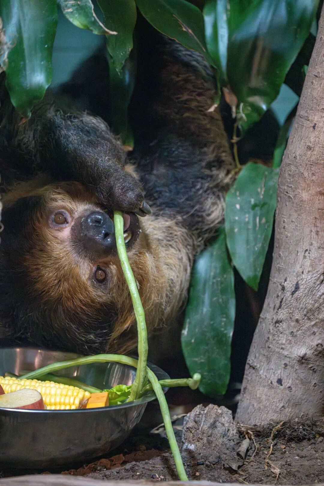 白天来打卡的话,可得提前做好“寻懒攻略”:它们要么蜷在暖气旁的树枝上呼呼大睡,要么藏在灌木丛深处“隐身”,几乎全程保持一个姿势纹丝不动,活脱脱像个“毛绒玩偶”。运气好的话,才能撞见它们打个慢悠悠的哈欠、轻轻挠挠痒,下一秒又立刻回归沉睡模式,慵懒感直接拉满!要是遇上天气昏暗,树懒会提前醒来,晃着脑袋望向食物篮——玉米可是它们的“心头好”,发现玉米后,就会沿着树干缓缓爬行,哪怕拼尽全力全速前进,每秒最多也只能移动6厘米。爬到食物旁,再慢慢伸出前爪勾取玉米,一口一口慢悠悠咀嚼,每一个动作都像按下了慢放键。