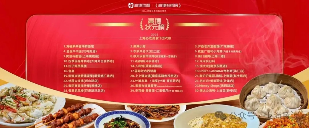 12月24日,高德扫街榜状元榜上海必吃美食Top30榜单正式发布。该榜单聚焦城市代表性风味,涵盖本帮经典、国际佳肴等多元品类,以真实数据为支撑筛选出口碑与人气双高的优质商家,为消费者提供权威可靠的寻味指引。