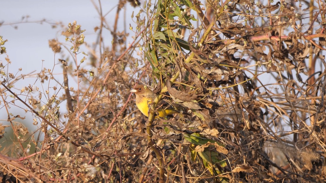 “它的头和胸部是醒目的栗红色,腹部则是鲜黄色,与上海常见的灰头鹀、栗耳鹀等种类截然不同。”唐磊说。意识到这可能是一个不寻常的发现,父子二人随即在接下来的三天(12月12日至14日)里对该区域进行了定点观察与拍摄,共记录到该鸟7次。