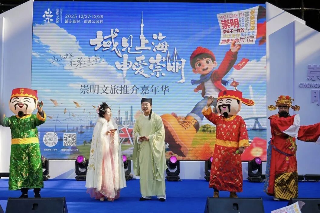 在“文”的板块,一只透明的气泡球内,一台老织布机静置其中,观众可伸手感受崇明土布的绵密质地。舞台之上,土布时装秀、源自渔猎文化的鸟哨表演、原创歌舞《崇明来信》等轮番上演,甚至还有上海昆剧团的专业演出跨界而来,展示了本土文化深厚的包容性与创造力。“商”的活力贯穿始终。市民不仅可以现场优惠预订民宿、年夜饭,购买各种文创产品,还能通过集章打卡、拼单折扣等趣味互动获得实惠,消费行为本身,也成了游玩体验的一部分。“体”与“旅”的板块则展现了崇明作为生态旅游目的地的无限可能。23家旅行社、景区、民宿及户外运动机构,带来了从东滩湿地观鸟、东平森林疗愈,到环岛骑行、绿华镇水上运动的多元化产品。特别是“崇明地标宴”的发布,标志着崇明旅游从观光走向深度的“味觉体验”,将优质农产品转化为高阶的文化消费场景。