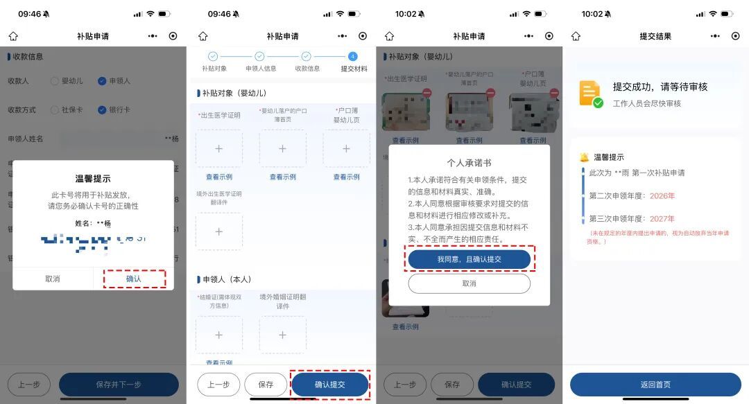 3.点击“立即申领”,选择“我要申请补贴”,查看办理须知及申请流程后,开始在线办理。按指引填写婴幼儿信息、申领人信息及收款账户。