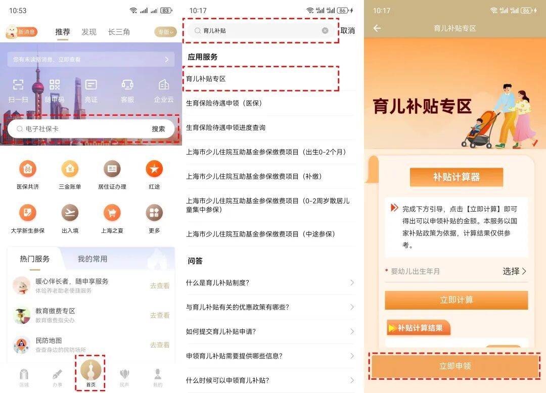 1.打开“随申办市民云”(App/微信小程序/支付宝小程序),首页点击“育儿补贴专区”前往申领。