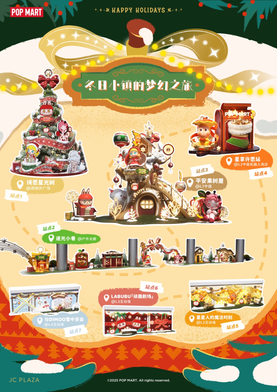 拉布布、星星人、DIMOO、MOLLY、SKULLPANDA(SP)、HIRONO 小野全都来啦!以“星光、梦幻、你最珍贵、泡泡礼物季”为叙事元素,现场不仅能拍照打卡、购买节日礼物,还能参与互动任务、收集节日心意。