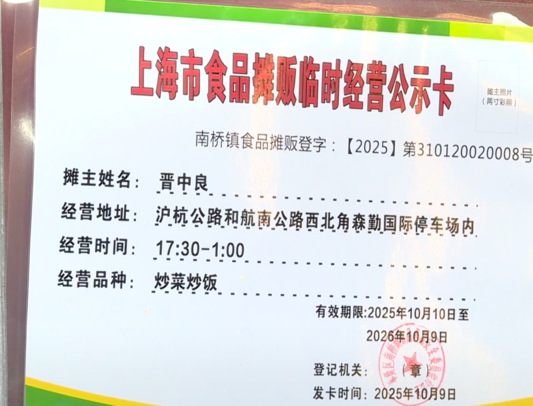 在每个摊位的醒目位置,都贴着一张临时公示卡。这是经过多道程序检测后方能取得的凭证,也是在此固定设摊的许可标志。与此同时,城管部门还会不定期开展检查,确保食品安全与环境卫生。黄贇涛介绍,摊位基本都安装了油烟净化器,相关部门也会对食品、人员健康等进行不定期抽查。