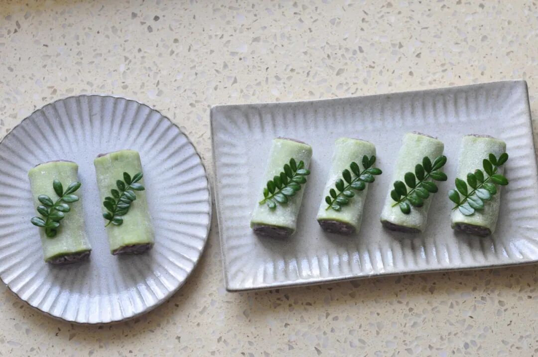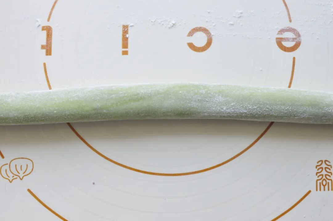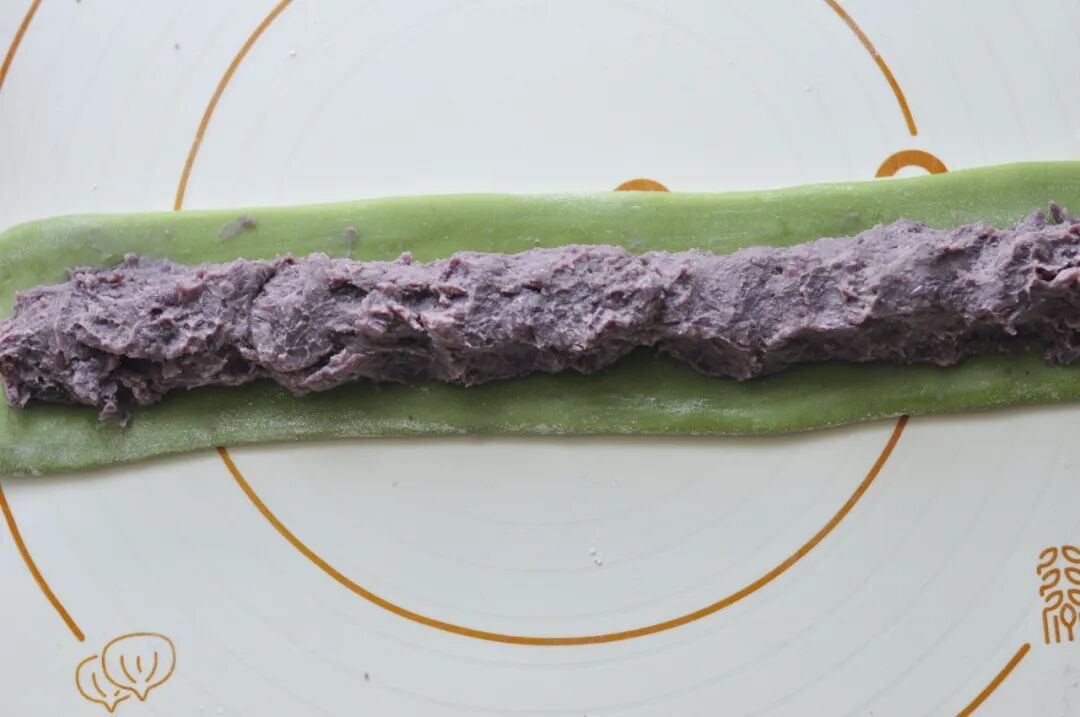 4.将抹茶糯米团擀成长条。若面团太黏,可在整形时撒点熟糯米粉。将红豆馅搓成长条,放在抹茶糯米团上。
