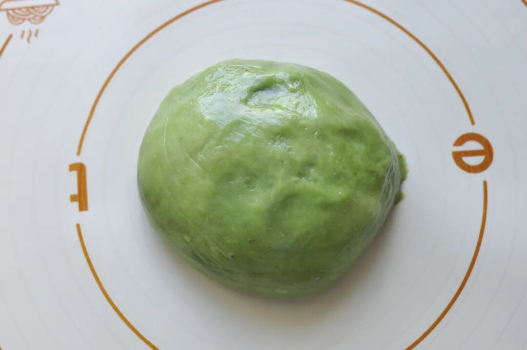 3.糯米糊盖上保鲜膜,上锅蒸20分钟,放至温热不烫手时,加入抹茶粉,戴上手套揉成均匀的抹茶糯米团。