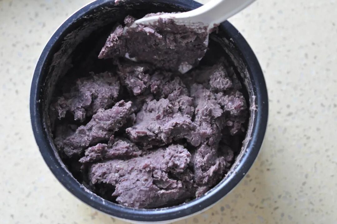 小贴士:煮红豆的时候,按平时煮米饭的水量放水,将豆沙煮得干一些。