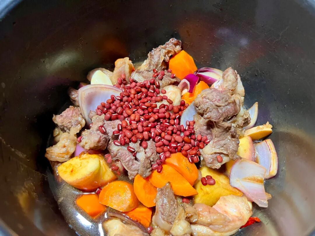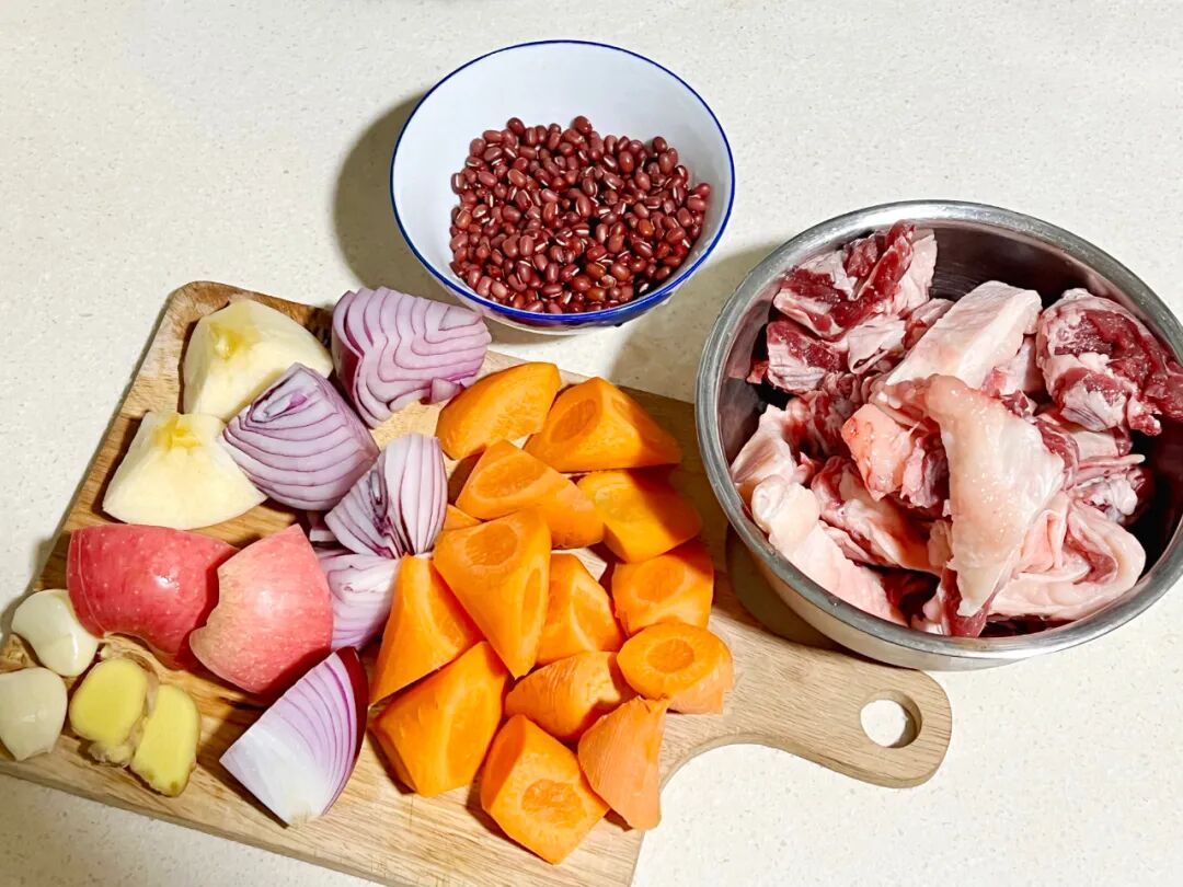 1.牛腩、胡萝卜、洋葱、苹果切成大块备用;将红豆清洗晾干。