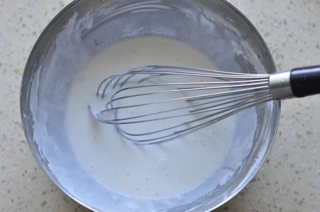 2.取100克糯米粉、20克玉米淀粉、20克白砂糖、135毫升牛奶、20毫升食用油,倒入容器中,搅拌成无颗粒的糯米糊。
