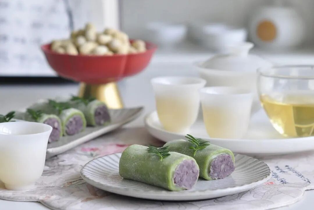 5.从一头开始捏紧收口,包住豆沙馅,做成抹茶红豆糯米条。在表面撒一层熟糯米粉,再轻轻地将抹茶红豆糯米条搓圆,做成粗细一致的抹茶红豆糯米长条。