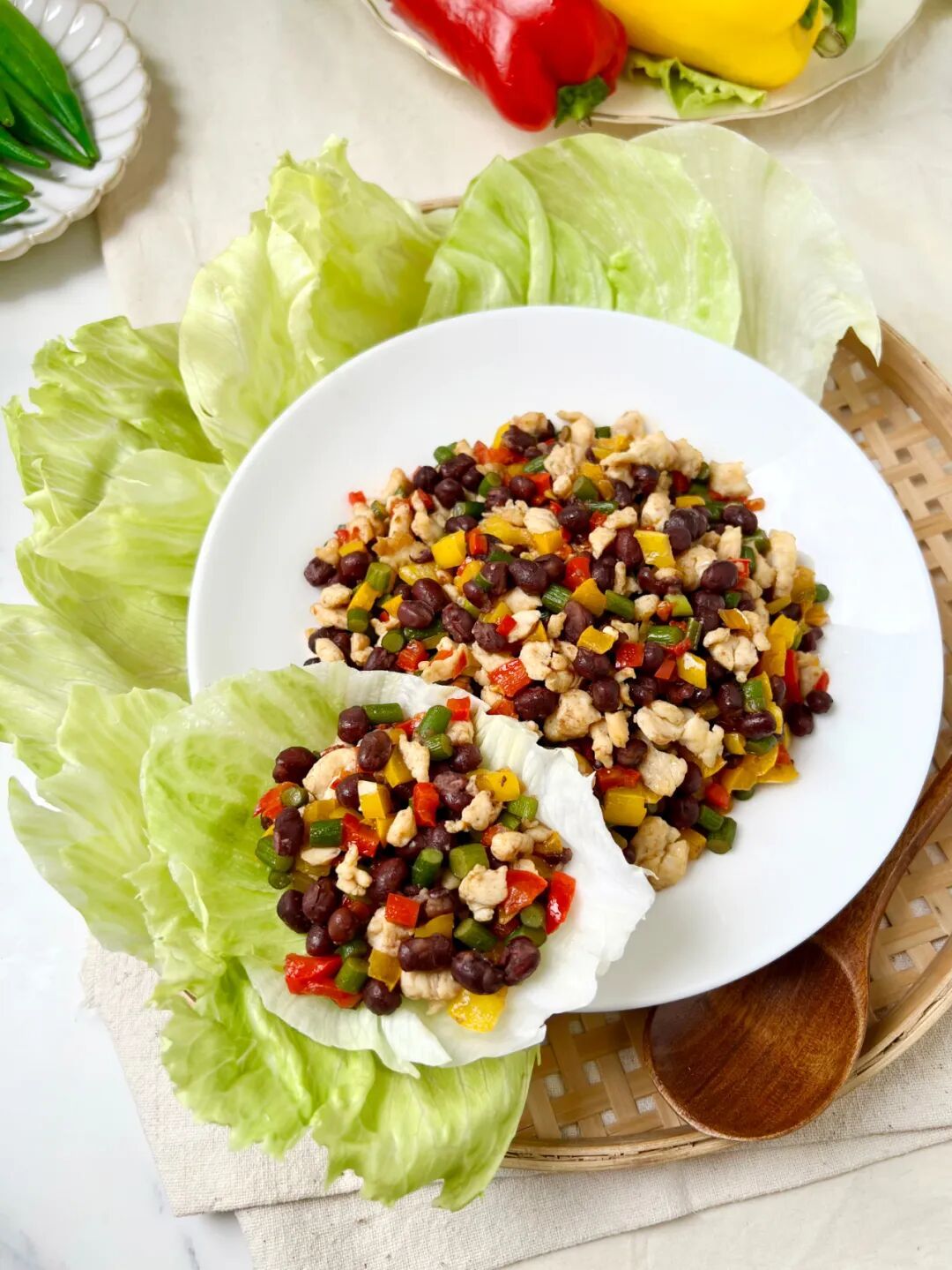 5.最后放入煮好的红豆,翻拌均匀,做成红豆鸡胸肉丁,盛入盘中。用生菜叶包裹红豆鸡胸肉丁食用。
