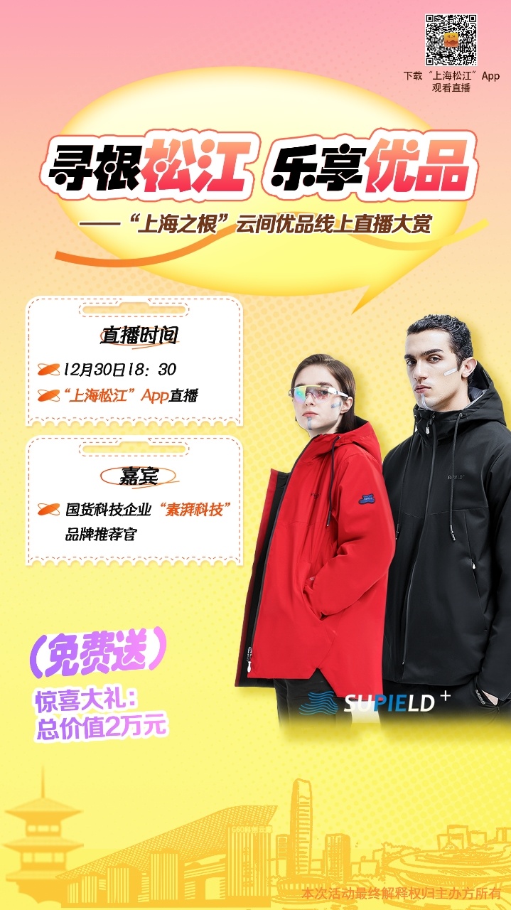 “上海松江”客户端作为“云间优品”直播大赏的官方平台,已成功打造多场本土企业专场直播,让云间优品走进千家万户。此次素湃科技专场,既是企业对本土消费者的感恩回馈,也是松江科创实力与本土品牌魅力的集中展现。12月30日下午6时30分,锁定“上海松江”客户端直播间,与素湃科技一同解锁科技保暖的奥秘,把温暖与惊喜带回家。