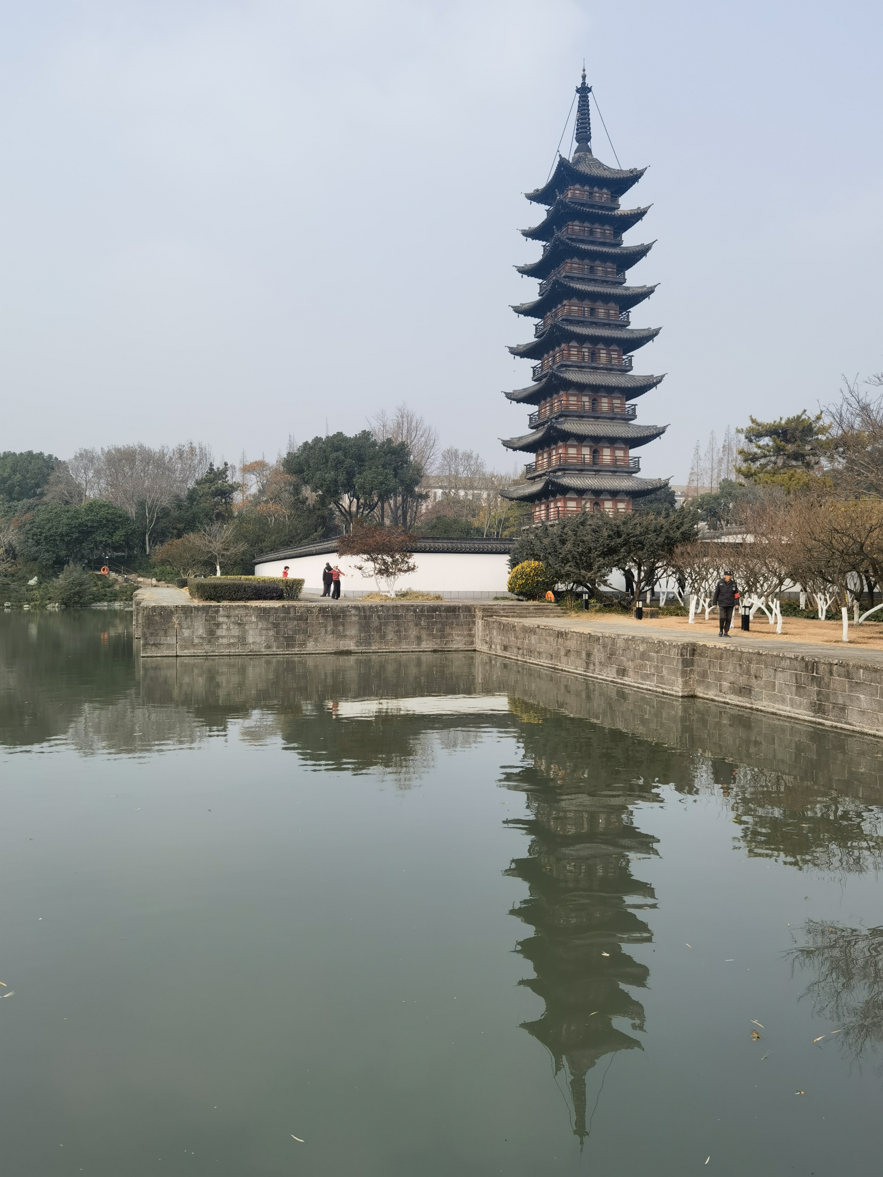 上午9时,松江的天空朦胧,能见度较低,阳光若隐若现,温度适中,体感较为舒适。方塔园内聚集了不少市民,他们在广场上散步、遛娃、打羽毛球,十分惬意。“今天比昨天低了两度吧,还挺舒服,早上的雾还是比较大的,所以出门晚了。”市民张女士告诉记者。