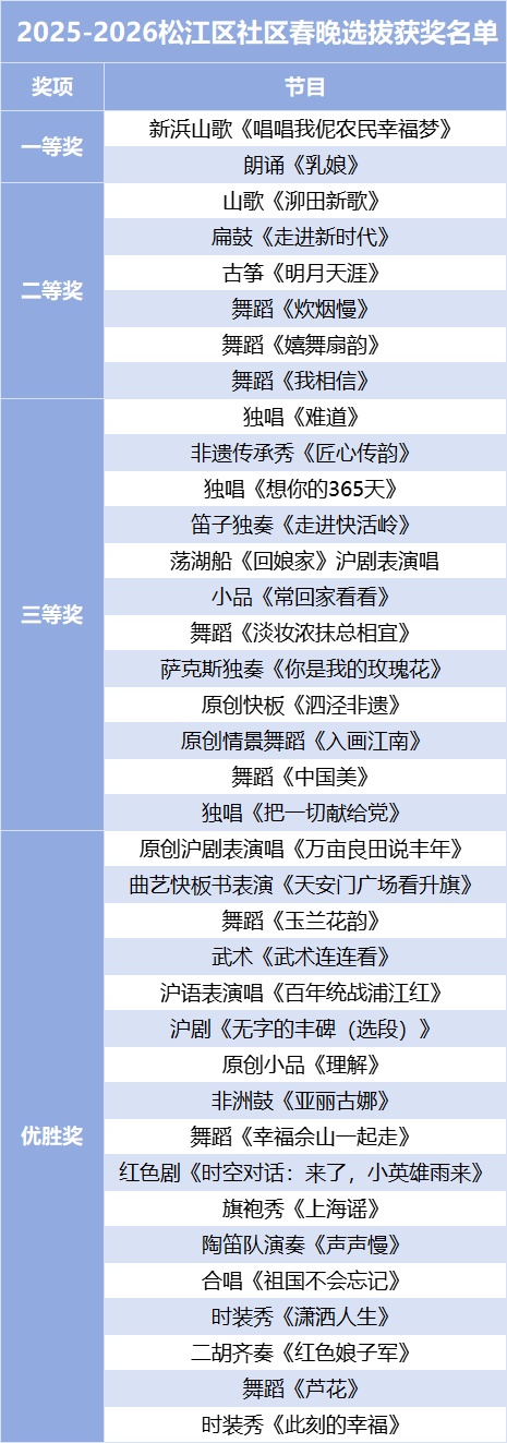 松江区社区春晚选拔不仅是一场全民才艺比拼,更是一次文化惠民的生动实践。本次获奖名单中的部分节目将有机会登上2026年1月底举行的社区春晚最终展演舞台。让我们共同期待松江百姓“民星”在春晚舞台绽放更多光彩。