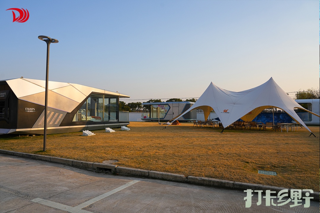 更有趣的是,在草坪上,还能看到许多主打科技概念的空间展示仓,像散落的宇宙胶囊,静静诉说着关于未来居住与科技的构想。