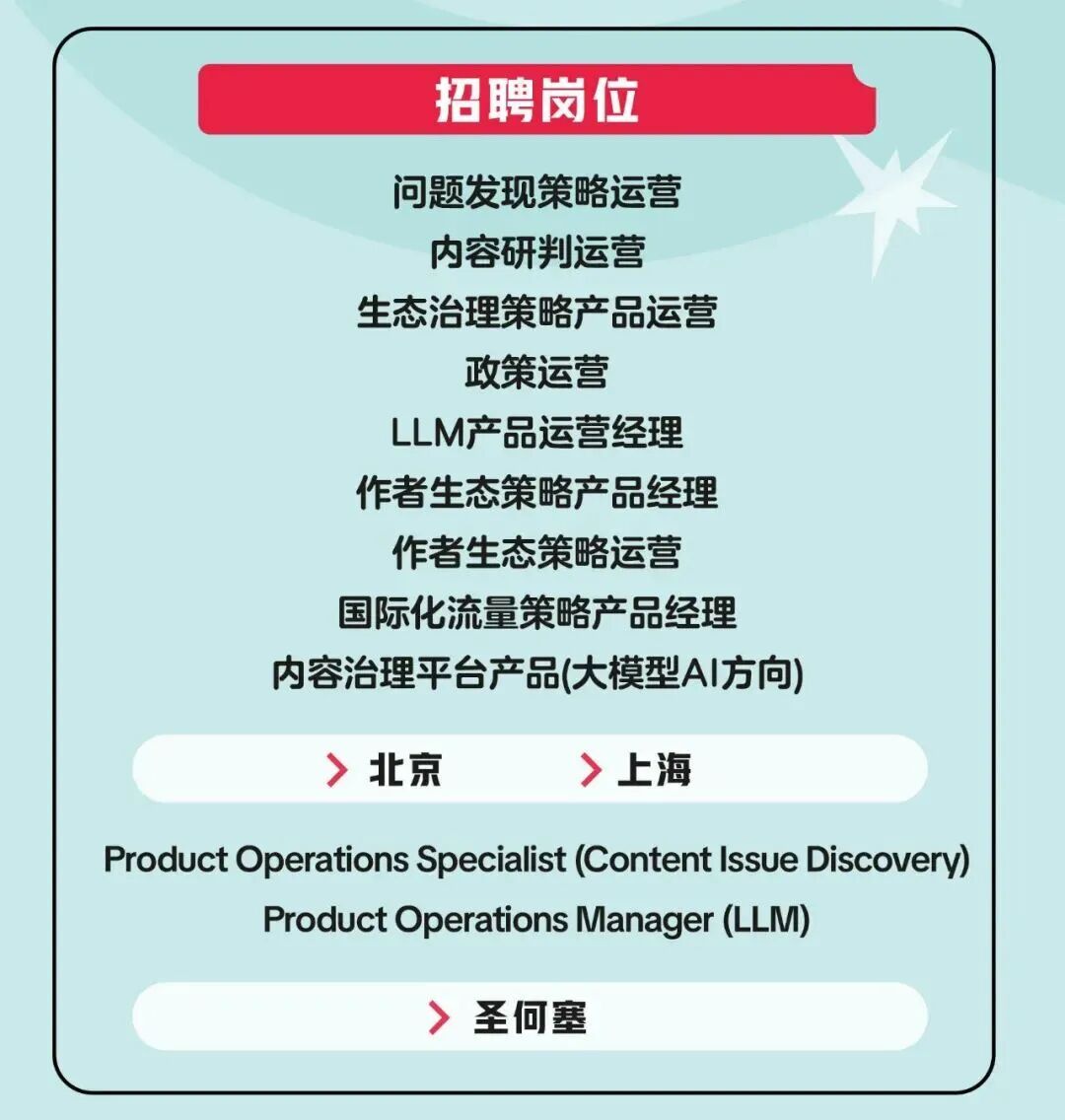 字节跳动TikTok内容生态团队社招!产品、运营岗,等你投!