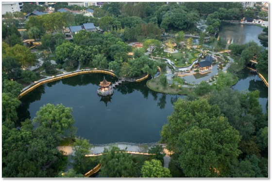 和平公园更新打造为生态公园、海绵公园、智慧公园及生物友好公园。生态方面,采用立体的植物搭配,增加开花小乔木等,将生态修复和展示相结合,打造生态公园。海绵方面,将“透水铺装、植草沟、景观湖体、防空设施改造的调蓄管”有机结合,实现雨水自然下渗和径流就地存储利用的雨水排放系统。