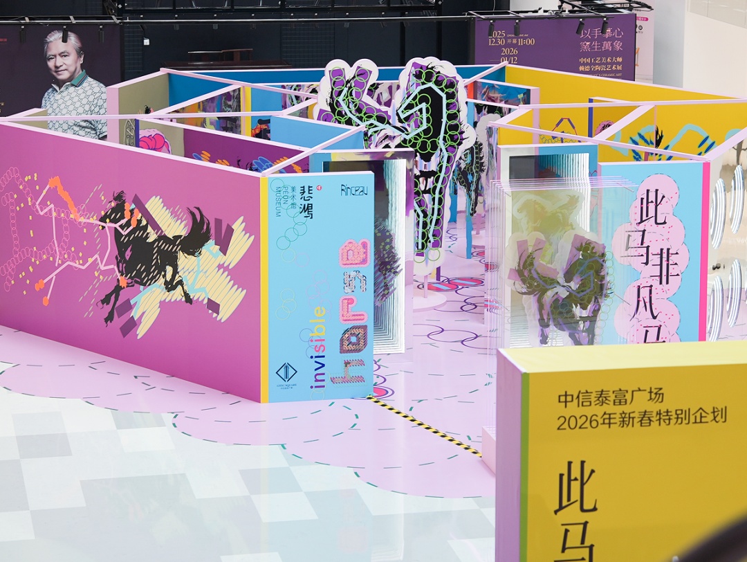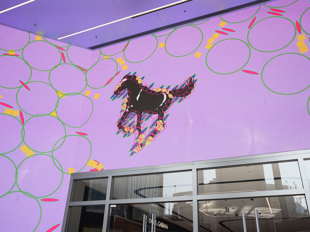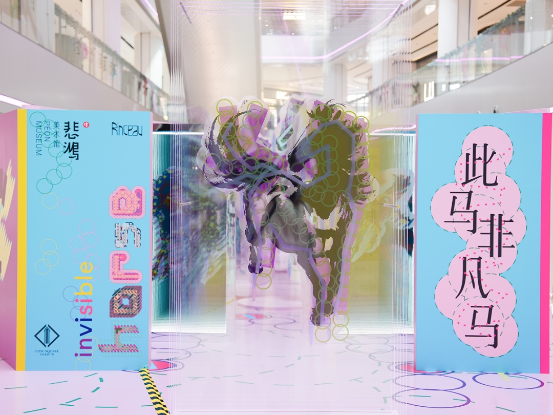 水墨里的骏马被拆解成几何、镜面的当代形态,传统笔墨的动势,让商场直接变成艺术展厅。