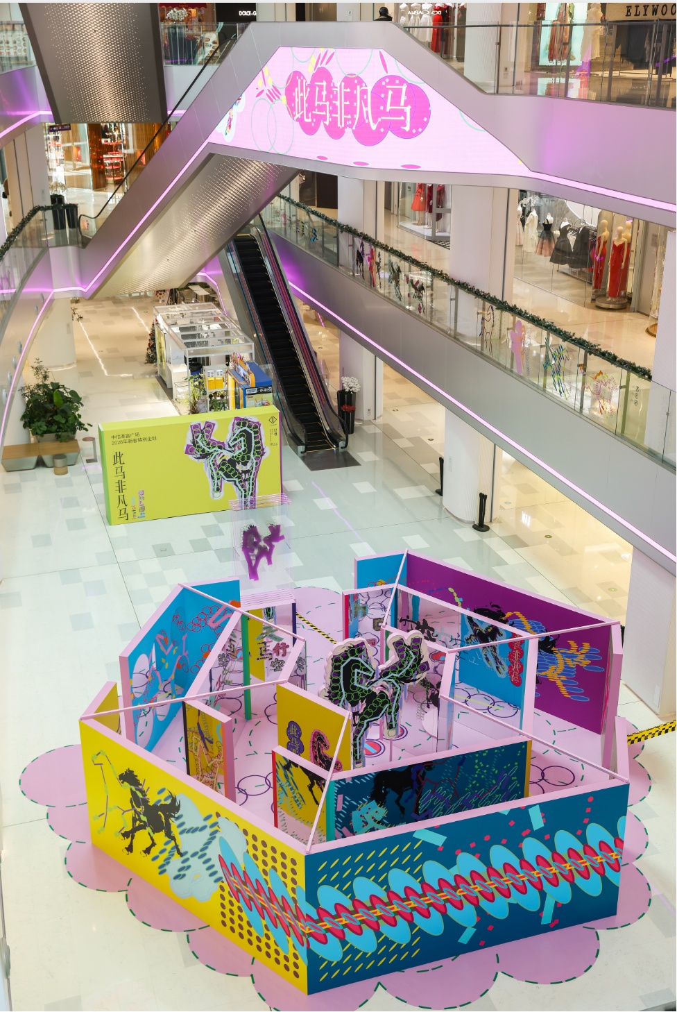展览以六边形迷宫呈现,迷宫中心是一匹由线条、色块与镜像三者构成的立体骏马,于迷宫中行走,即是在以身体重新“书写”马的轨迹。从几何到动势,从线条到整体,最终抵达“此马非凡马”的当代诠释。