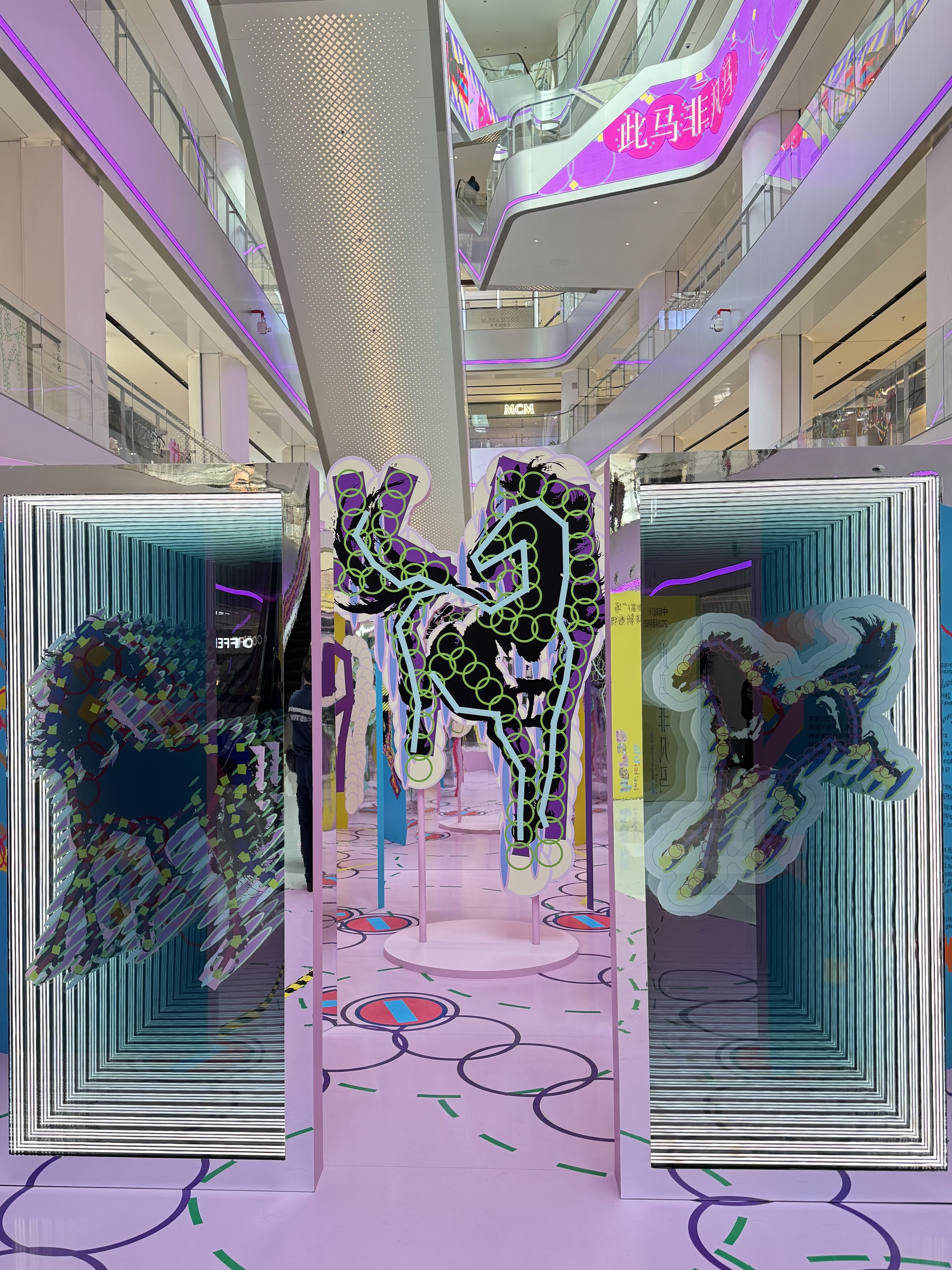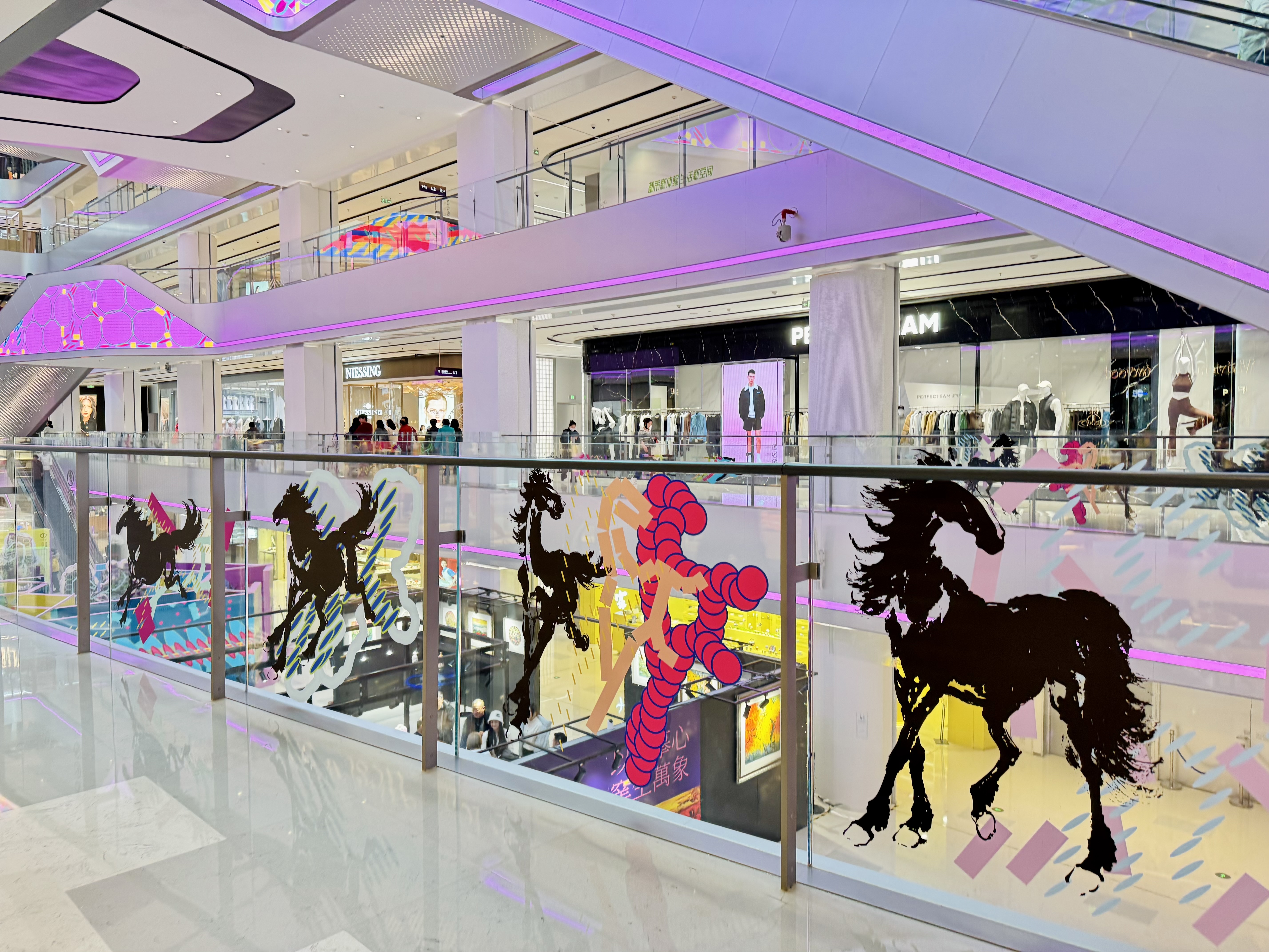 中信泰富广场选取了徐悲鸿作品中数个最具代表性的马之形象为装置奠基,并突破简单的“平面复刻”,结合Rinceau标志性的“Invisible”隐形视觉逻辑,打造了一套独属于今天的“马之语法”。通过线骨、动势与几何块面的层叠,徐悲鸿笔下“疾行、停驻、回望、跨越”的马之神态,在镜面空间中获得了立体的新生。