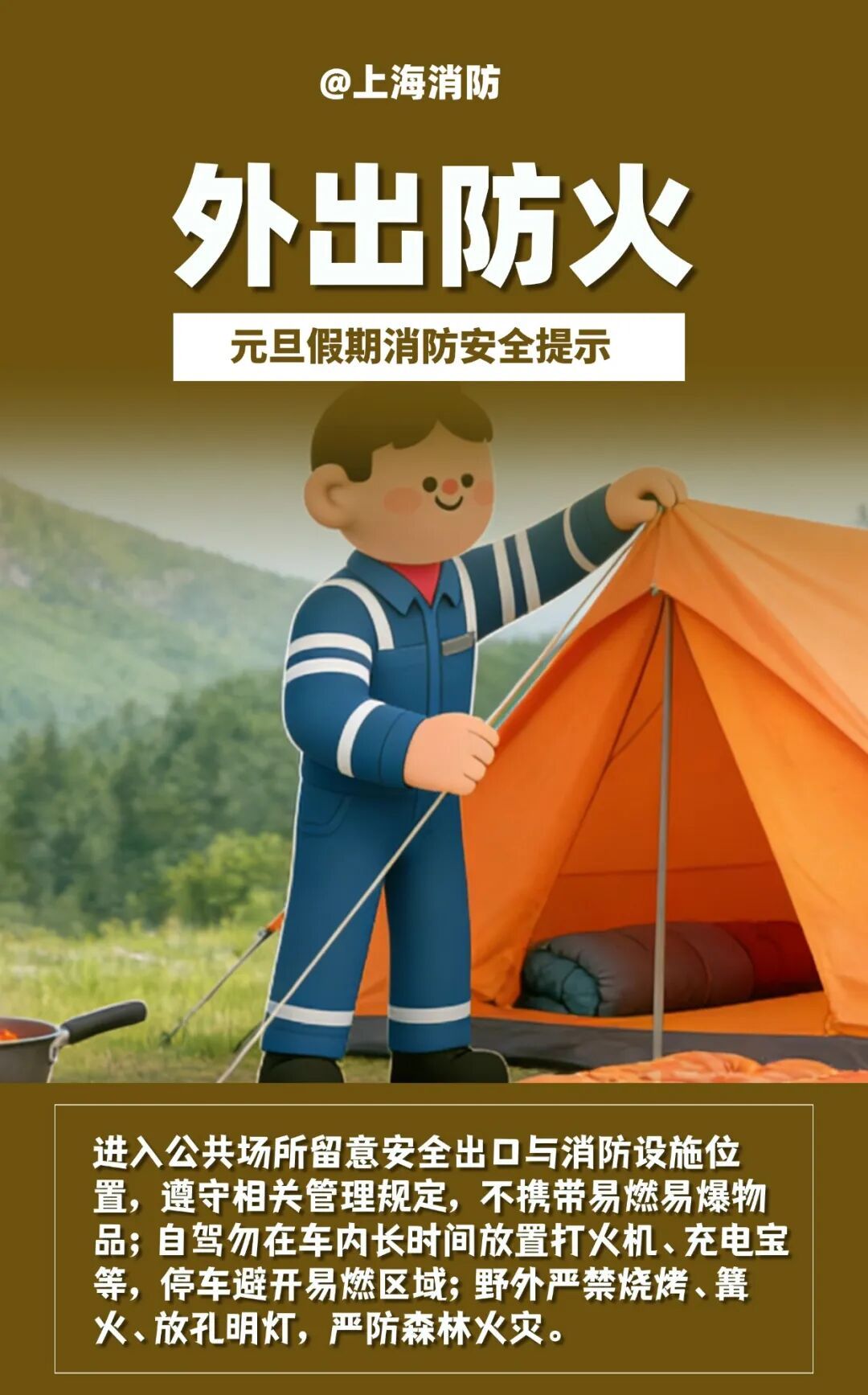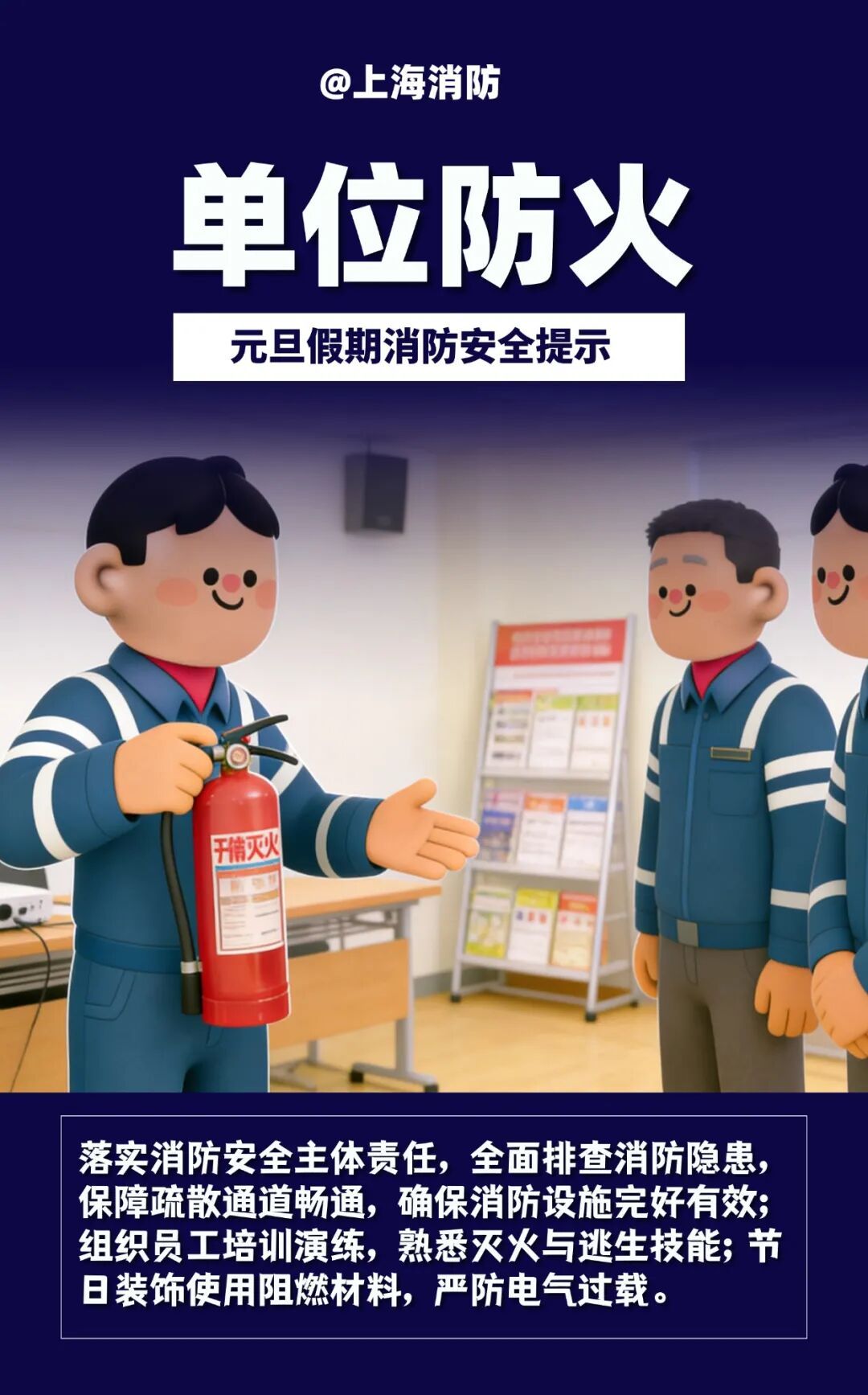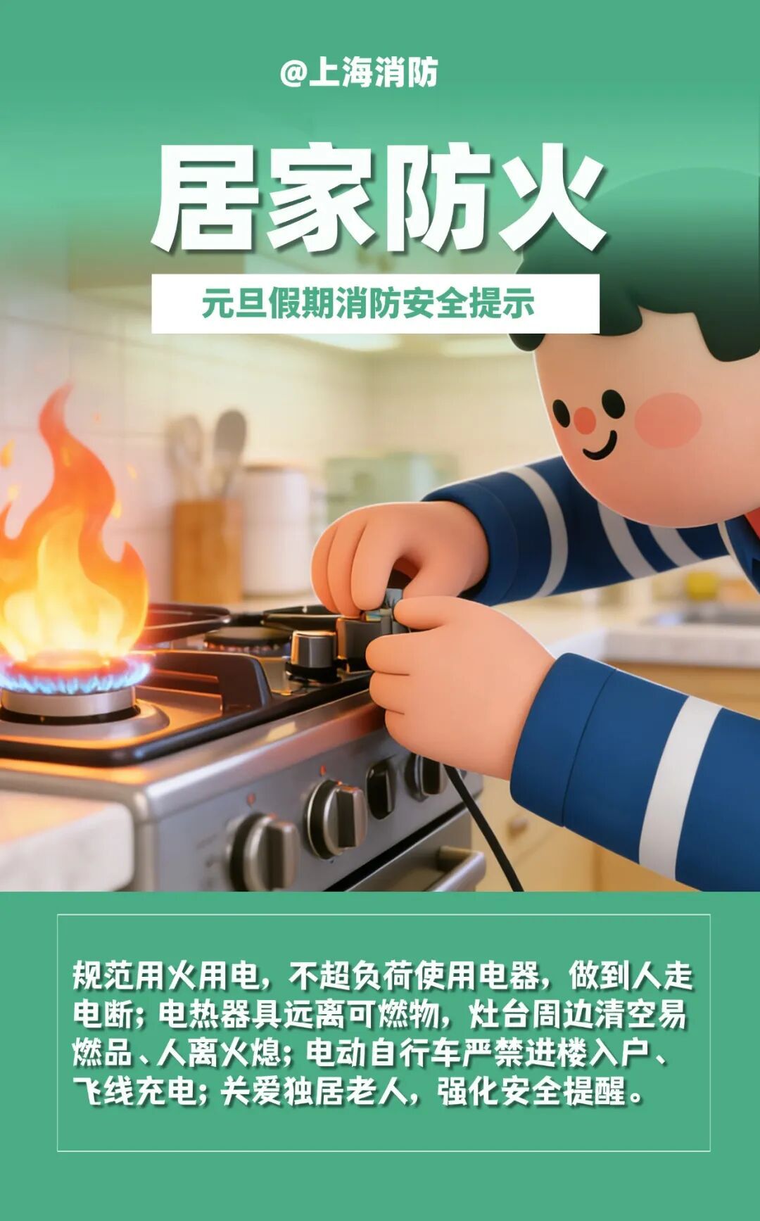 元旦将至,节庆活动增多,人流物流密集,加之元旦假期期间,本市受寒潮天气影响,有明显降温、大风和局部弱雨雪天气。 31日上午起强冷空气开始影响本市,预计48小时(12月31日-2026年1月2日)最低气温降幅可达7~9度。2日和3日早晨市区最低气温0度左右,局部地区有薄冰;2日早晨郊区最低气温零下3度到0度,有薄冰或冰冻,3日早晨郊区最低气温零下5度到零下3度,有冰冻或严重冰冻。 企业居民用火、用电、用气量大幅增加,火灾风险也随之上升。为守护您和家人的平安团圆,上海消防温馨提醒:请多一分细心,少一分隐患;多一份防范,多十分安心。以下元旦假期消防安全提示,请您查收并共同践行。 新年将至,平安为先 上海消防全体指战员 将始终坚守岗位、枕戈待旦 做您身边最可靠的“火焰蓝” 愿您欢度元旦,阖家幸福 我们继续为您守夜、护航、保平安 祝全市人民元旦快乐、岁岁安康