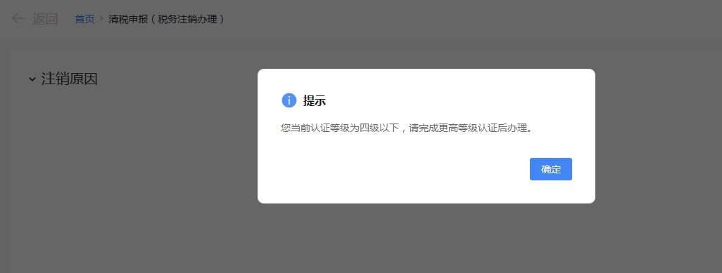 申税小微,我们想办理税务注销,但是操作的时候提醒我要完成更高等级认证后才可以办理,这个应该怎么操作呀?