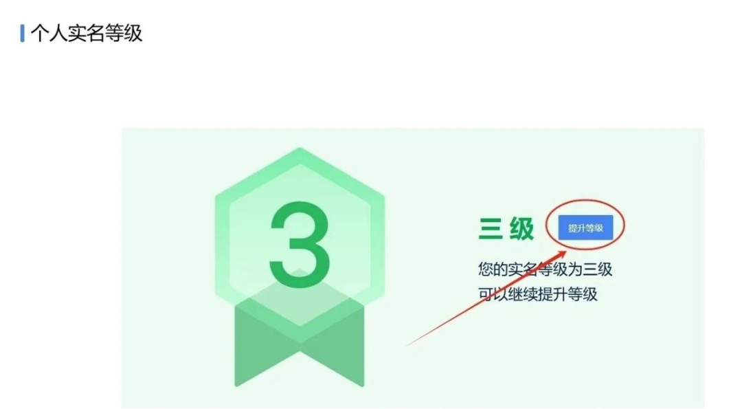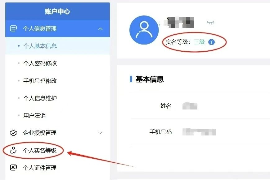 进入“账户中心”后,在左侧菜单栏找到并点击【个人实名等级】,页面将显示您当前的实名等级(如三级)及相关认证信息。