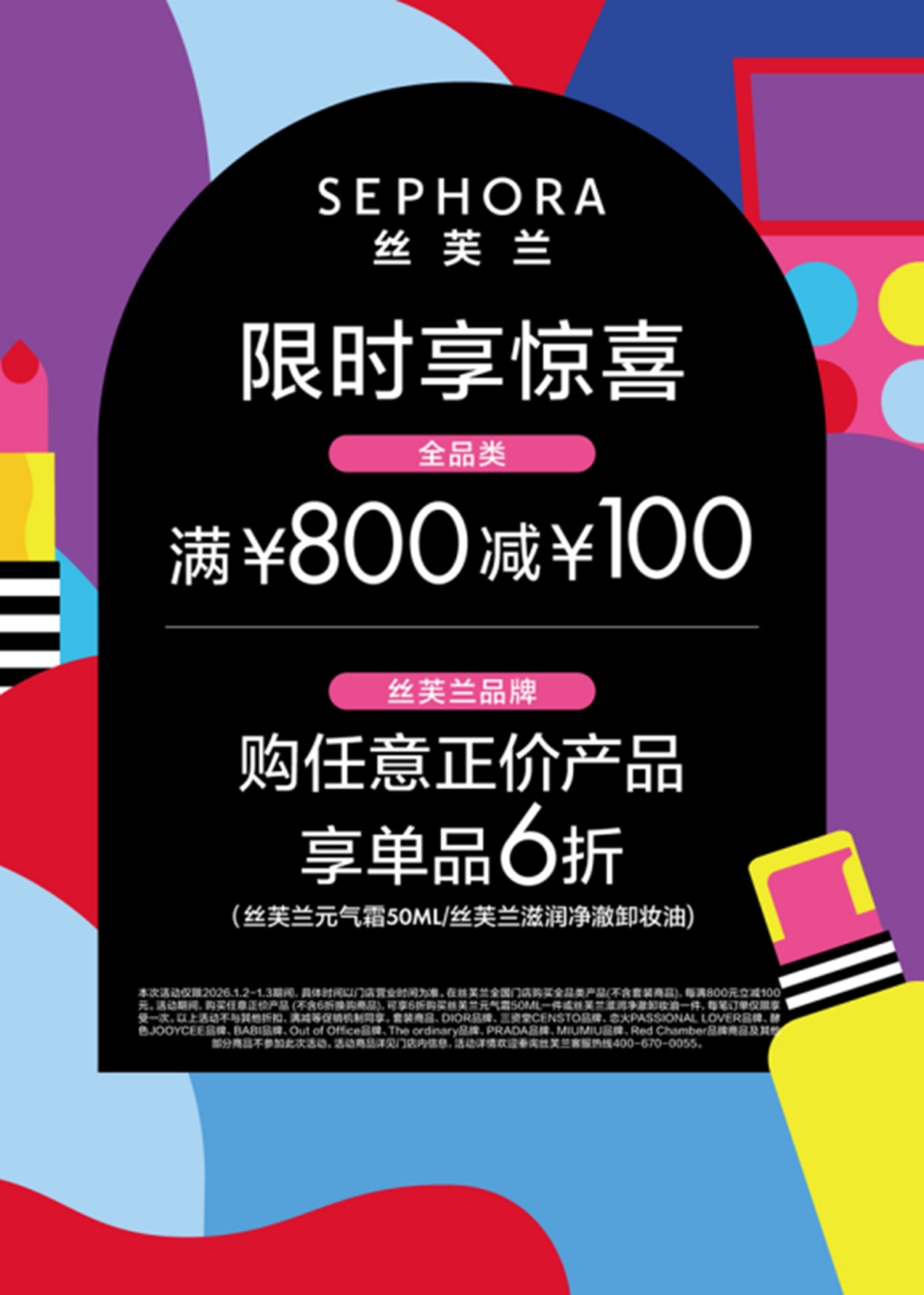 丝芙兰:2026.1.2-1.3期间:(1)全品类,每满800减100;(2)购买任何正价产品,即可6折购买指定产品。