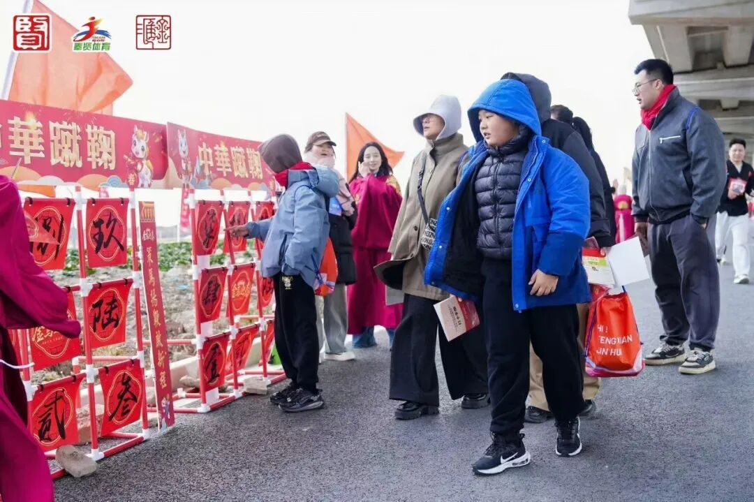 尽管寒风凛冽,参与者们热情不减,沿着5公里乡野步道健步前行。本次活动创新推出“徒步穿乡野、非遗进赛道、年俗聚集市”三维体验模式。赛道沿途巧妙设置了8个集章打卡点,将金汇镇的非遗文化与趣味运动深度融合,为参与者打造了一场集运动、休闲、娱乐于一体的乡野潮玩盛宴。参与者完成全程后可领取纪念奖牌,许多市民在寒风中脸颊通红,却笑容满面。