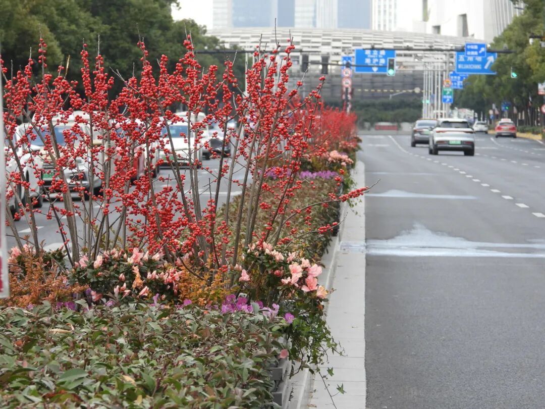 在长阳路中央隔离带花箱中,北美冬青作为主景,搭配金叶石菖蒲、粉色西洋杜鹃、亮金女贞、火焰南天竹等植物,营造出寒冬中丰富的层次感与生命力。北美冬青花期长、挂果持久,枝头红果饱满莹润,犹如天然玛瑙,在冬日萧瑟中格外醒目。这一设计以红果的热烈与金叶的暖意,为道路注入活力,既美化了环境,也为行人带来视觉享受。