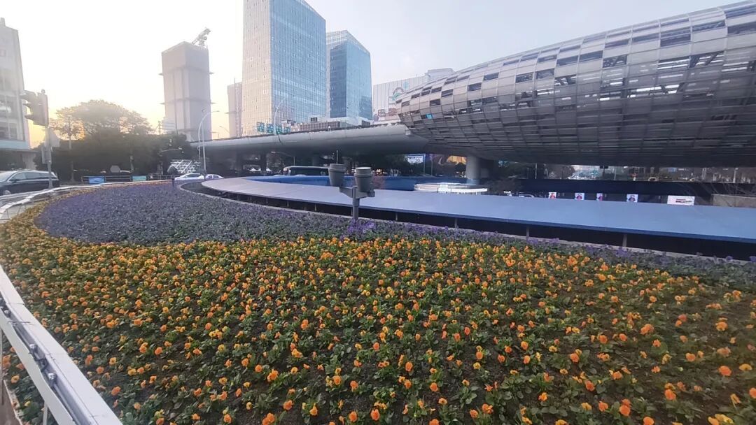 五角场环岛花坛以蓝、橙双色角堇为主,通过流畅的波浪曲线营造动感氛围。蓝色静谧,橙色温暖,色彩对比鲜明,既打破道路单调,又传递出活力气息。值得一提的是,蓝色角堇区域还预埋了郁金香种球,待早春时节,郁金香将陆续开放,与角堇共同构成更加丰富的景观层次,使花坛从冬到春持续焕发生机。