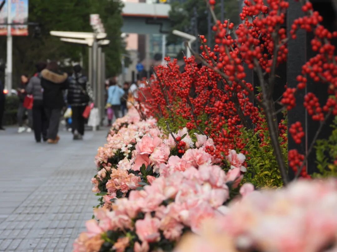 在四平路、国定东路、控江路等主干道沿线及合生汇广场一侧的花箱中,运用“三层递进”手法打造微型景观。第一层以北美冬青为核心,红果夺目,奠定喜庆基调;第二层配以桃红色西洋杜鹃与亮金女贞,色彩对比鲜明;底层辅以多色角堇,如紫、白、黄等,使整体景观更加饱满生动。