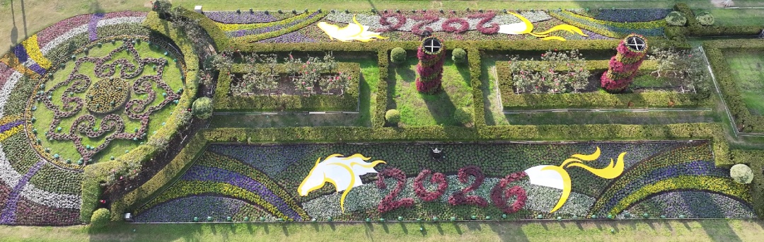 景观主体为骏马造型,明黄色亚克力线条勾勒出奔马姿态,动感十足。白色石子塑造出马头的立体线条,栩栩如生。火焰南天竹修剪出的“2026”字样热烈醒目,与马的形象相呼应。角堇作为背景花卉,粉、紫、黄、白等多色交织,绚丽多彩。波浪形植物带如祥云环绕,形成“云马奔春”的生动画面。材料上注重对比与融合,亚克力的现代感与石子的自然感相互映衬,整体视觉效果鲜明而富有张力。