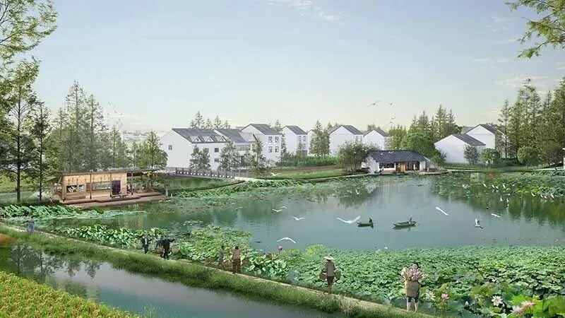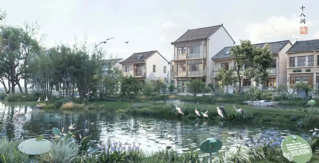 据介绍,新元单元首发区域由大蒸港、张文荡、范塘、东庄港等横塘纵浦围合,总面积约3.53平方公里,以“村包田”圩田肌理的保护与传承为基础,构建起棋盘水网、五域荟萃、多点璀璨的设计结构,维系着“大水绕田、环村包田、村依水生、水连溇沼”的蓝绿基底。这里以水陆双生聚落为脉,活化“田村相依、人水共生”的三生空间,营造出“乘舟踱步,沿环览千年人文荟萃;极简极美,归田阅遗存农耕记忆;原真原乡,筑典型棋盘水乡风貌”的整体空间意象。