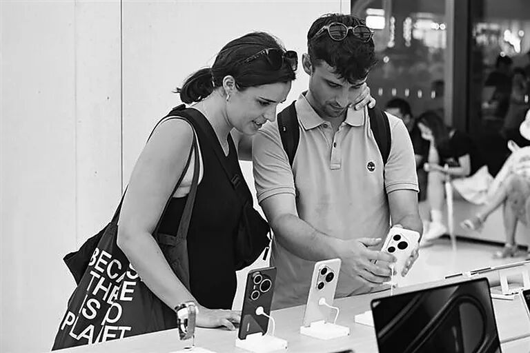 2025年7月17日,西班牙游客在上海南京路步行街的华为商店里浏览手机产品。
