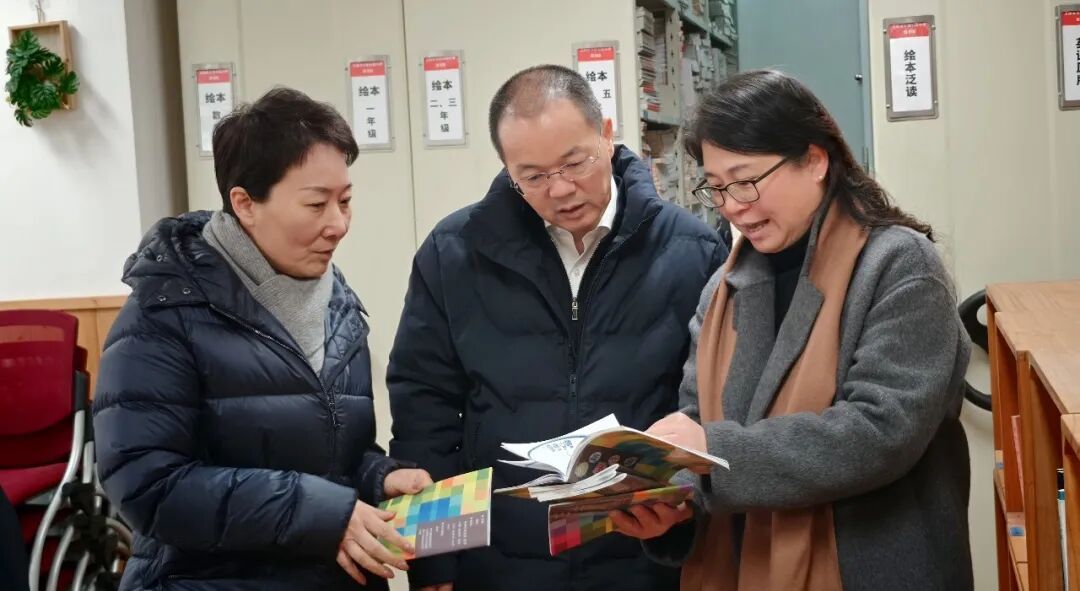 调研中,唐劲松一行实地走访了学校办学环境,并走进操场、美术教室、木工坊、图书馆等功能场馆,详细了解版画课程、科技创作及全科阅读开展情况。